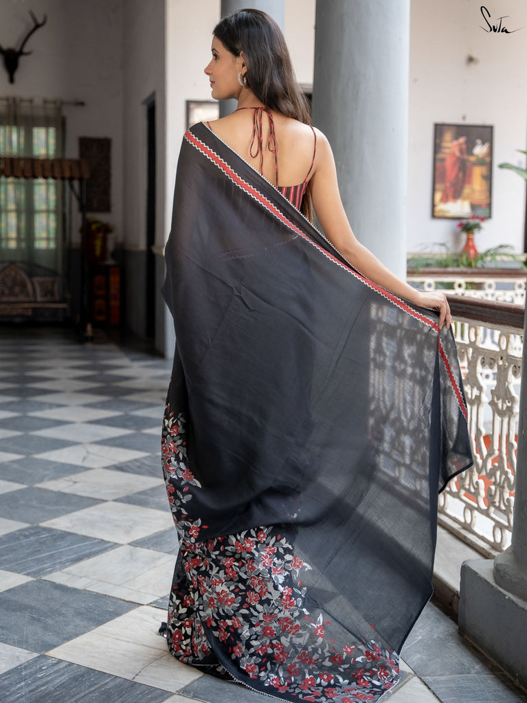 A captivating print featuring a vibrant array of flowers enriches the saree and adds a hint of subtle shimmer featuring delicate foil prints along the border. Tone-on-tone stripes on the body of the saree is an absolute visual treat.