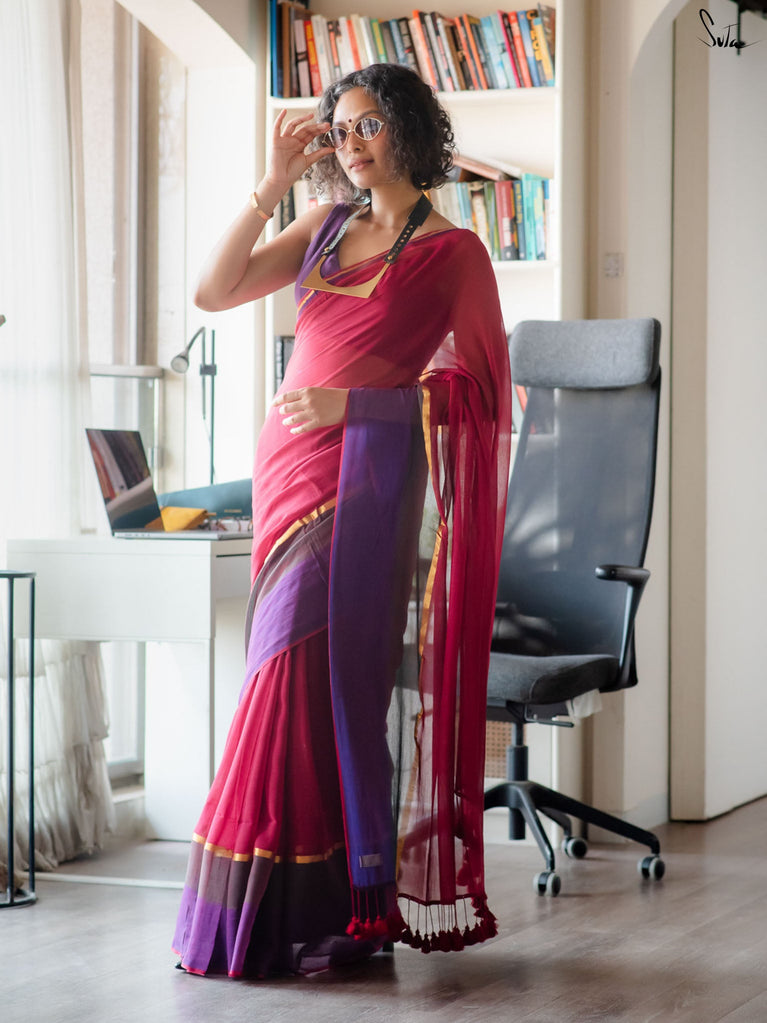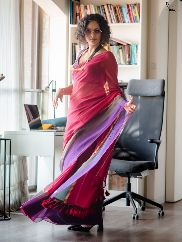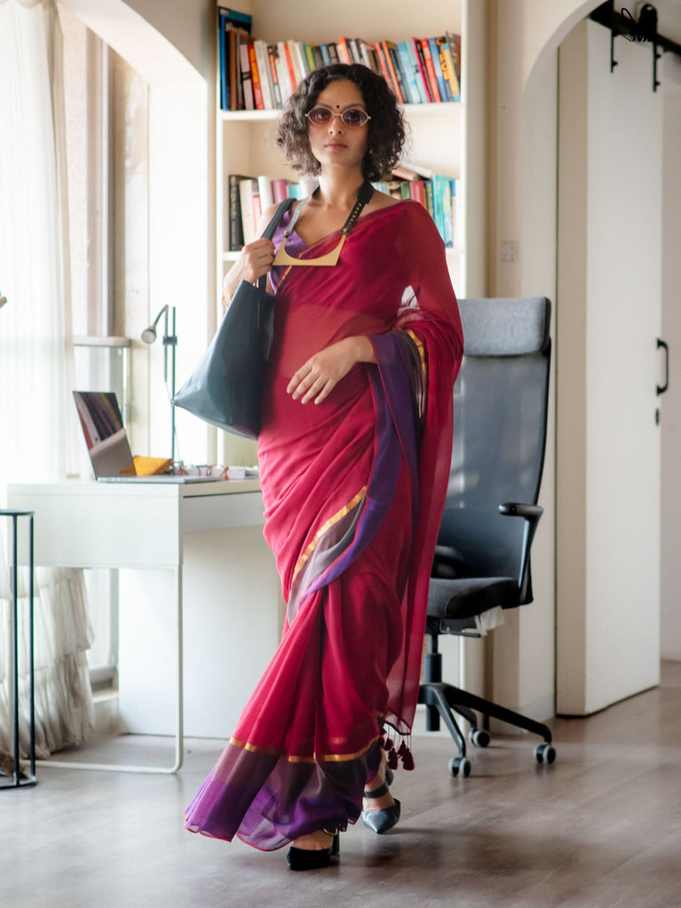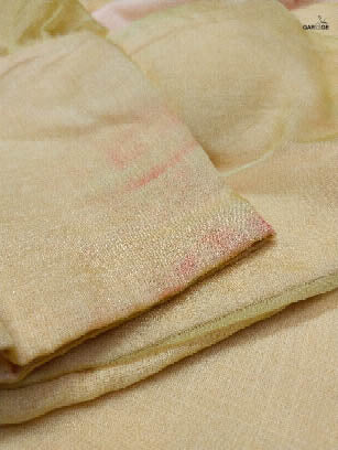 This saree has been handwoven by a master weaver in the Mashru tradition. The Mashru weave is said to have originated in West Asia, in the 19th Century. The fabric is woven with a silk weft and a fine cotton warp. It thus combines the ageless comfort of cotton and the timeless aesthetic of silk, elevated by the presence of gold and silver zari.