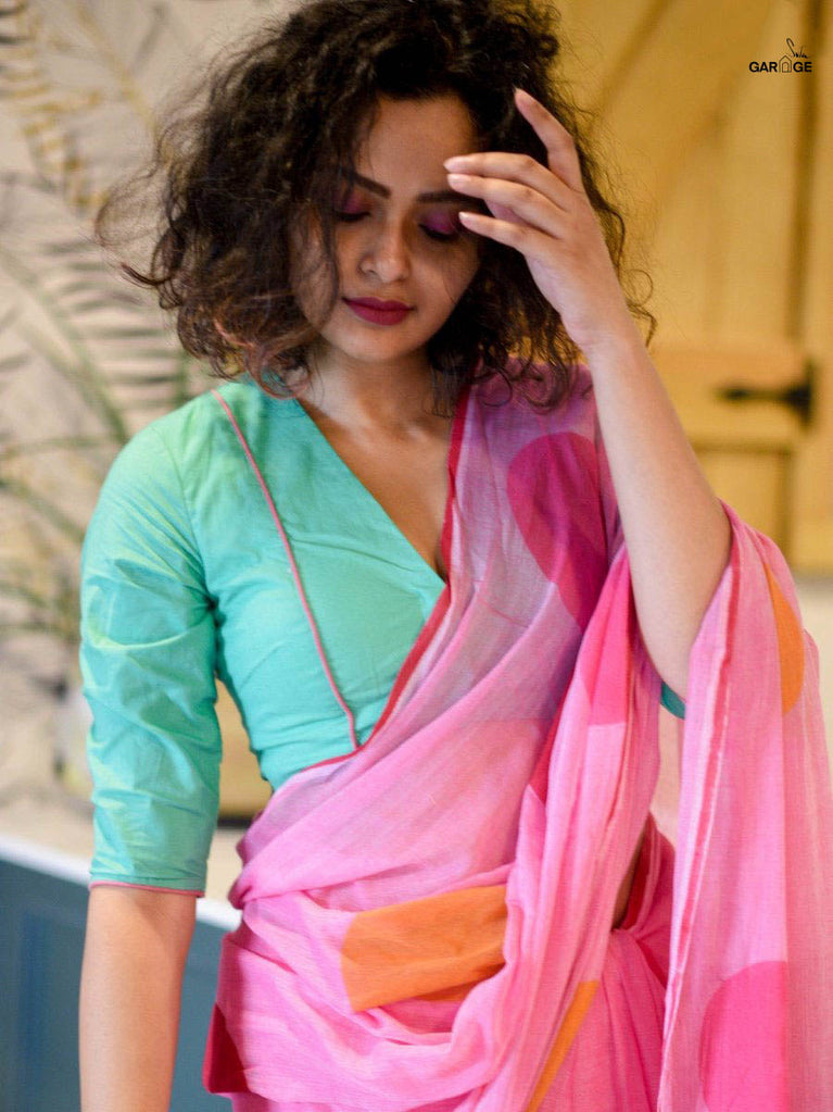 Su, the model is wearing size S blouse and the saree is In my Desert Planet Polka.