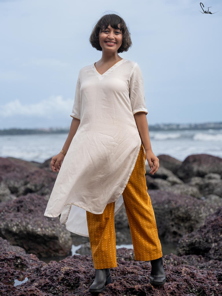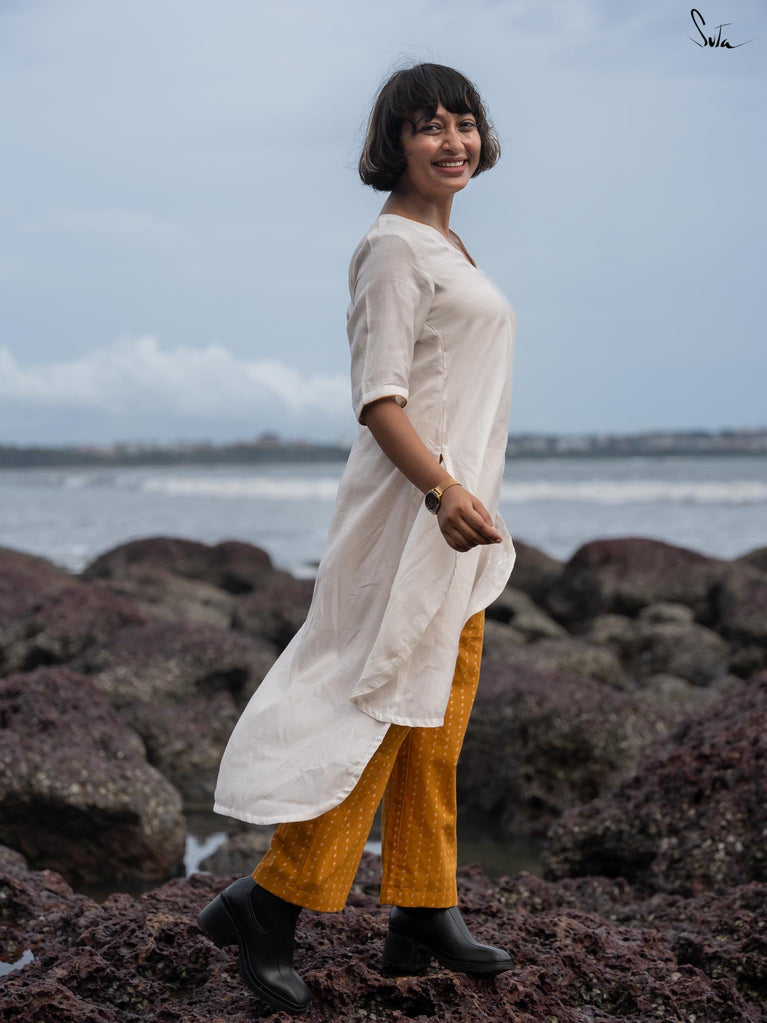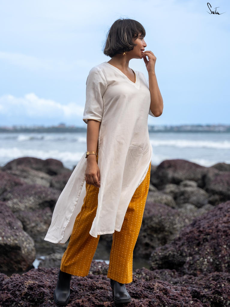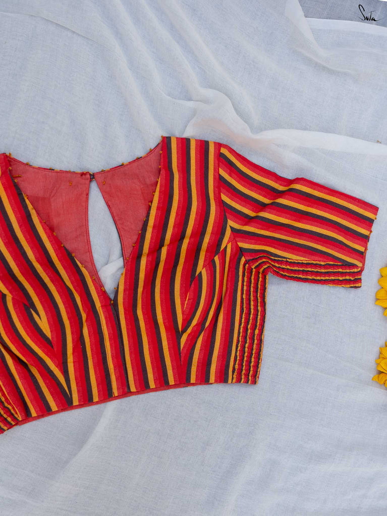 Bright, playful, and full of movement, this blouse mirrors the lively hues of Basant. The soft cotton fabric keeps it breathable, while the V-neck and quarter sleeves offer an easy, flattering fit. Side elastic adds gentle stretch, and the back keyhole detail finishes it with a touch of charm.