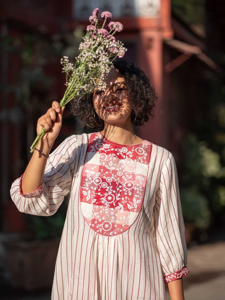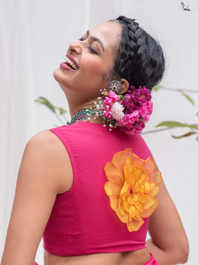 Sweet, feminine, and full of spring charm, this blouse stands out with a handcrafted marigold appliqué blooming softly at the back. The cotton cambric fabric keeps it light and breathable, while the U-neck, sleeveless silhouette, and side elastic ensure ease and comfort through the day.