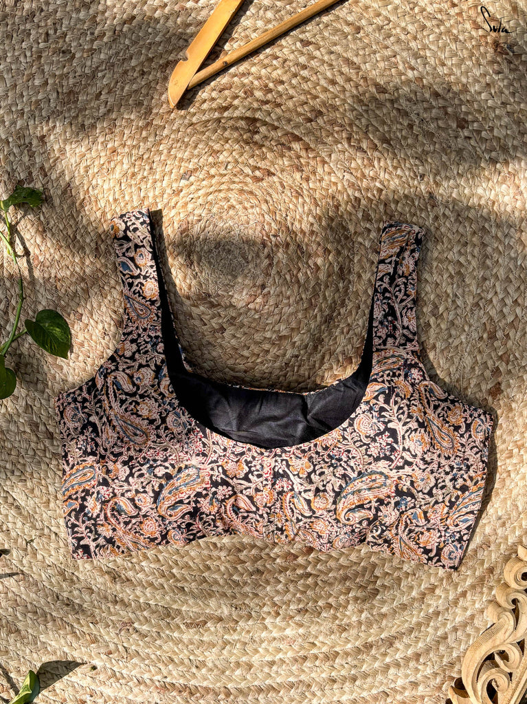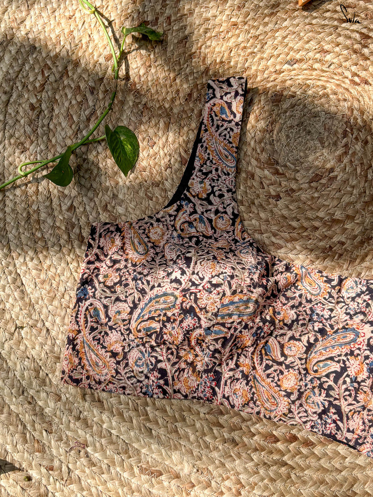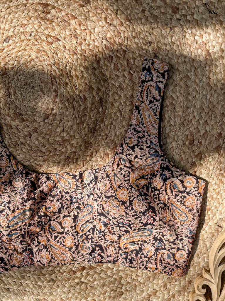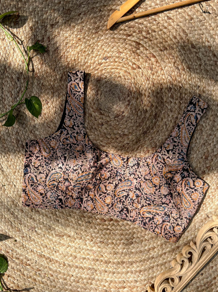 A blouse that exudes elegance and mystique, Bronzed Shadow features a flattering full-sleeve design with a chic V-neckline and front hook opening for a perfect fit. Made from soft cotton, this non-padded blouse is adorned with maroon, black, and grey floral prints. Pair it with any saree for a sophisticated and elevated look perfect for both casual and festive occasions.