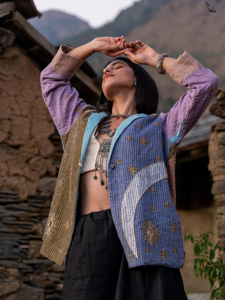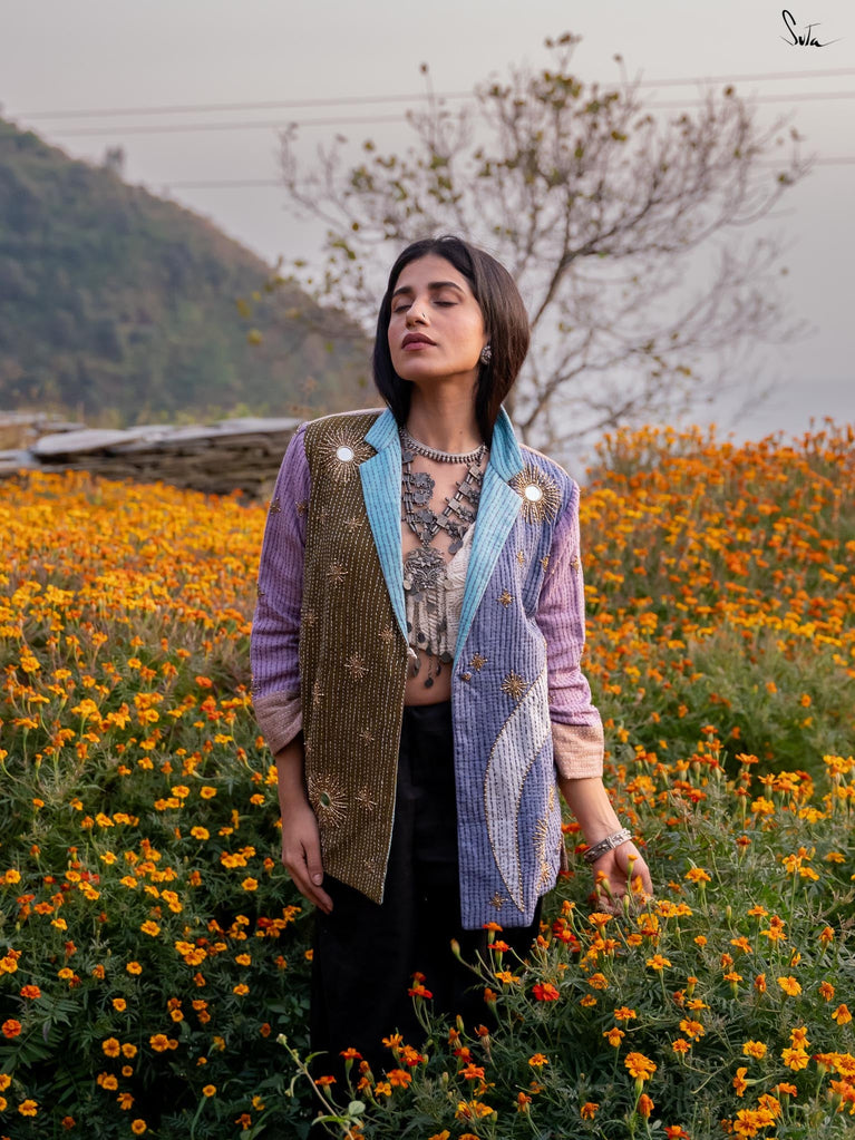 Arue celebration of craftsmanship, Chand Buta from Suta’s Bageecha collection reflects the immense time, love, and hard work that our artisans have invested. The jacket is hand-quilted in a multicolor fabric, with the Katha running stitches laying the foundation for its vibrant design. The stunning mirror work, bead embellishments, and zari embroidery are all carefully handcrafted, requiring meticulous skill and hours of patience. These elements give the jacket its glamorous and festive feel, making it a unique piece that stands out. The artisans love for their craft is evident in every stitch and bead, as they pour their heart into transforming the fabric into a work of art. The jacket is not just a piece of clothing, but a canvas of tradition and modernity, woven together with love and time. Each element is passed from one pair of hands to another, carrying the stories and dedication of the craftsmen who have worked tirelessly to create something beautiful.