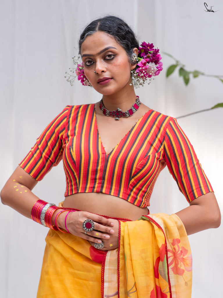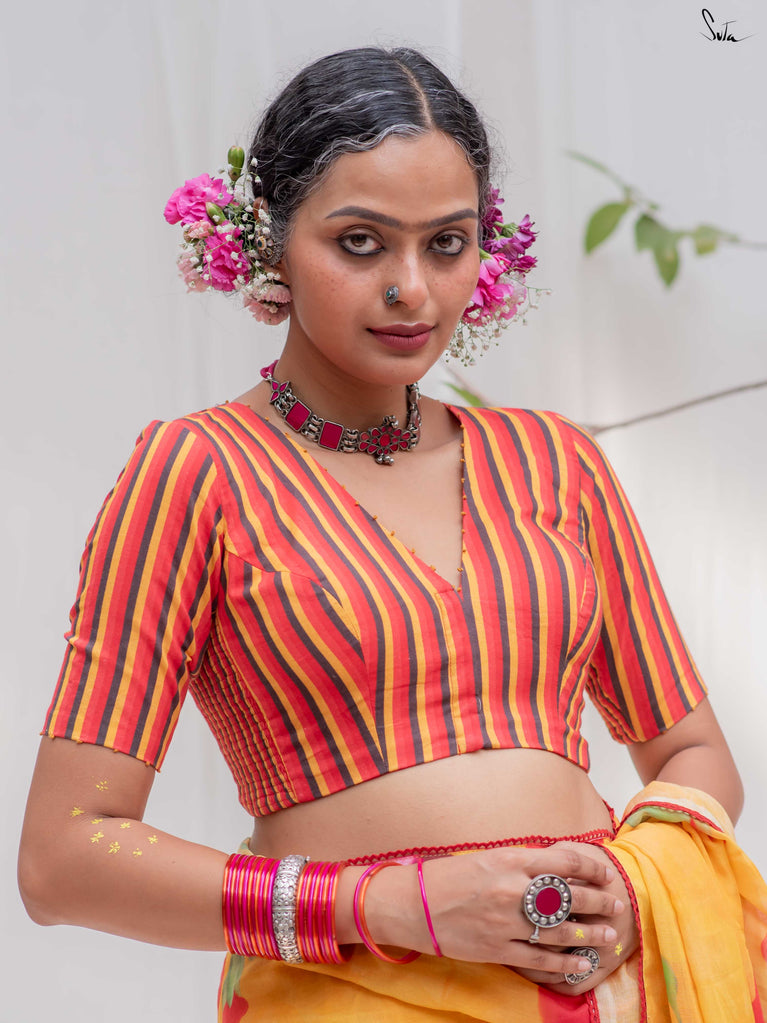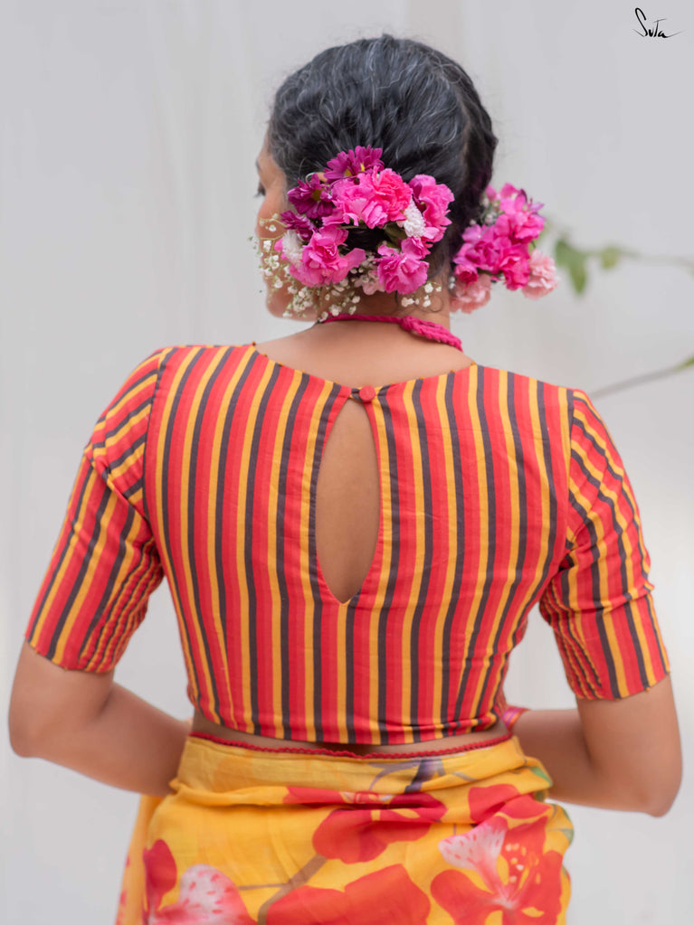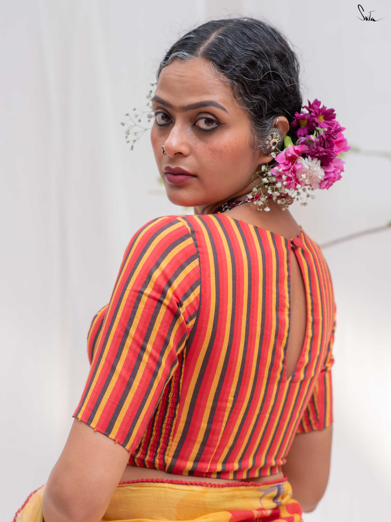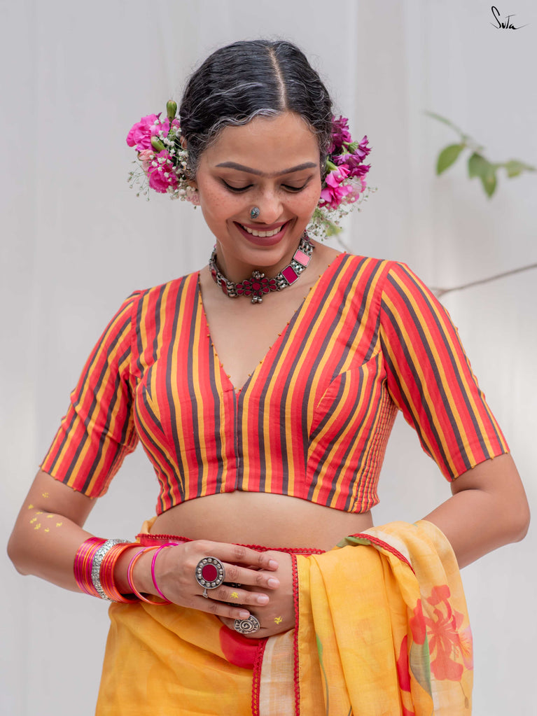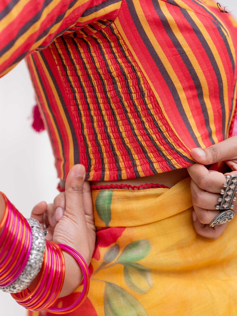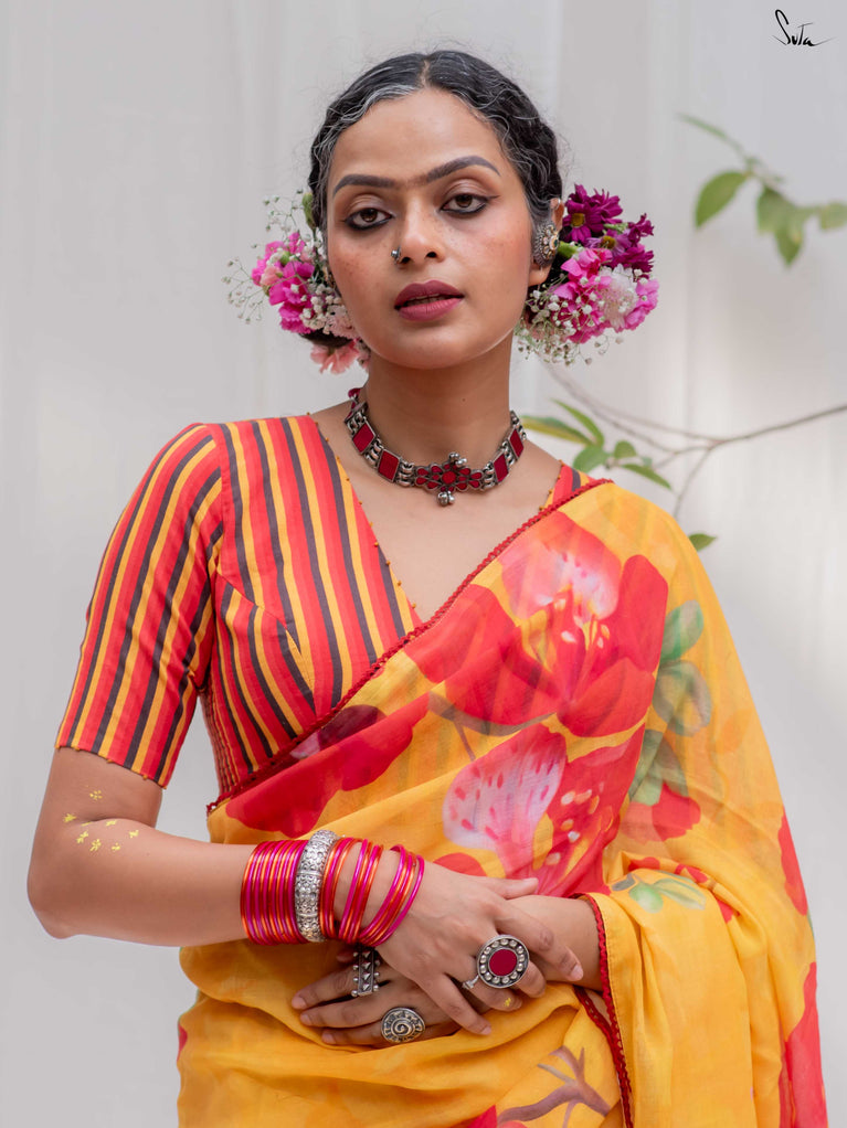 Saree: Su, the model is wearing a size S blouse and the saree called Genda Sa Basant