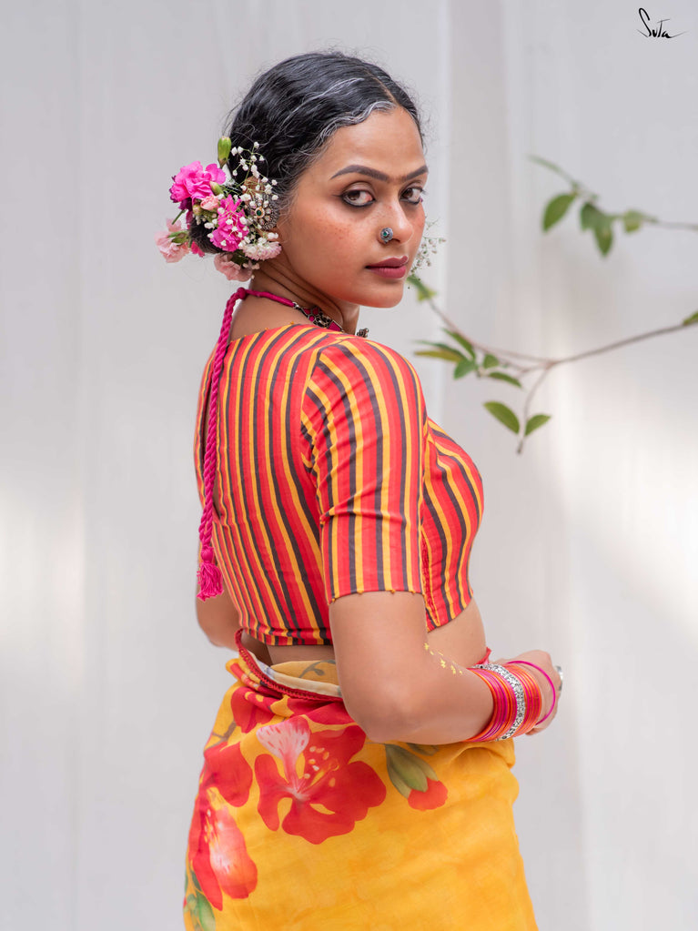 Saree: Su, the model is wearing a size S blouse and the saree called Palash Sa Basant