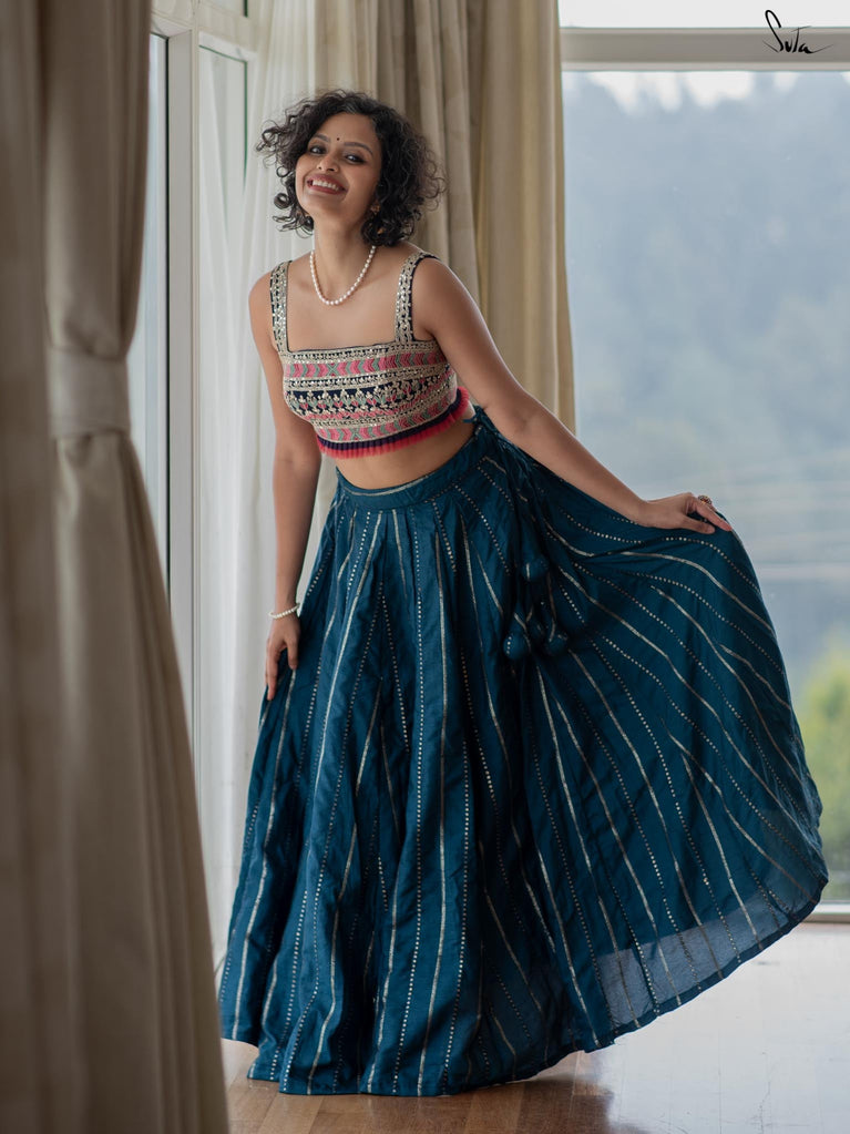 Uncover your hidden glam with the 'Damini Rekha' lehenga, an exquisite machine-embroidered masterpiece, featuring a stunning navy blue hue. This art silk lehenga also features a side zip and knot opening, making your inner style shine through every outing!