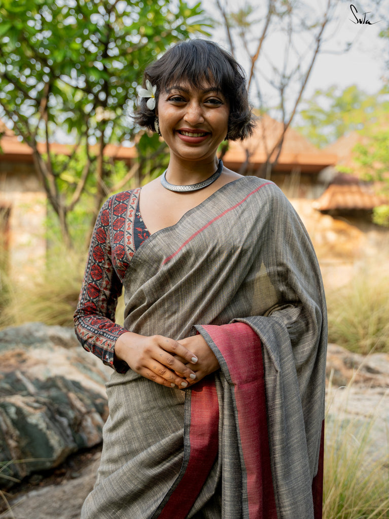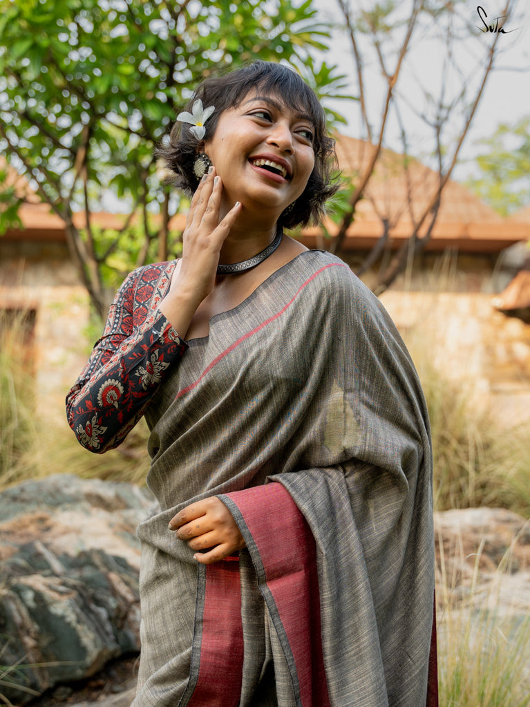 You’re the moon; soft, glowing, impossible to ignore. Inspired by this thought, we designed something that reflects you. This grey mul cotton saree feels peaceful and grounding, like a quiet moment to yourself. The zari-lined border adds just the right amount of shine, while the magenta-accented pallu brings in a soft pop of brightness. The contrast of grey and magenta tassels ties it all together with thoughtful detail. It’s perfect for slow festive mornings, quiet rooftop evenings, or cozy, intimate gatherings.