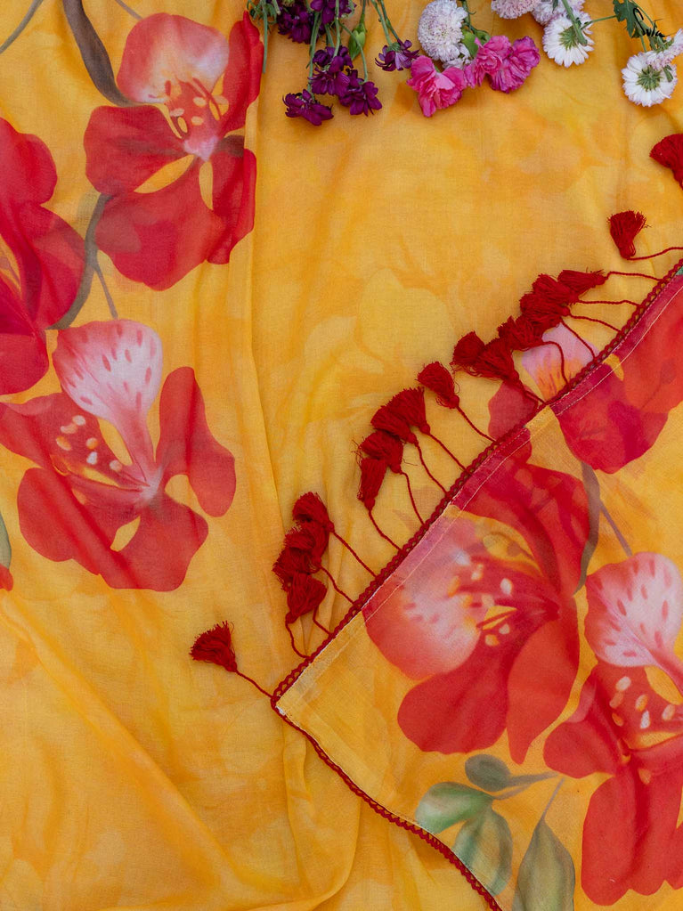 Inspired by the first gentle warmth of spring, this saree carries branches, florals and little birds in bloom. The mul-modal drape is light, airy and soft on the skin, making it effortless for everyday wear. Bright rust tassels add a playful touch, like kaner blossoms catching the sun.
