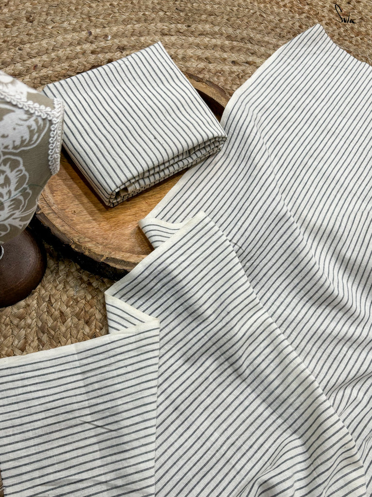 Like silver linings- bright and hopeful, this light blue mul cotton saree is all about easy elegance. The contrast selvedge adds a touch of character, and the zari lines on the pallu catch the light most softly. A pop of lime green and matching tassels bring in a fresh, summery surprise. Perfect for daytime events, office parties, or lunches that turn into laughter-filled afternoons.