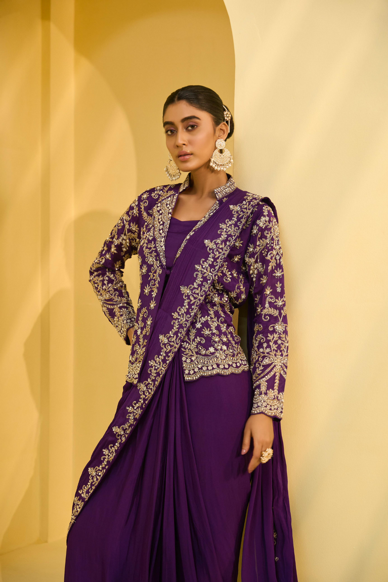 This designer Indo-western outfit features a multicolor embroidered short kurta paired with flared pants. The playful silhouette, vibrant detailing, and modern cut make it perfect for mehendi functions, festive gatherings, or intimate celebrations.