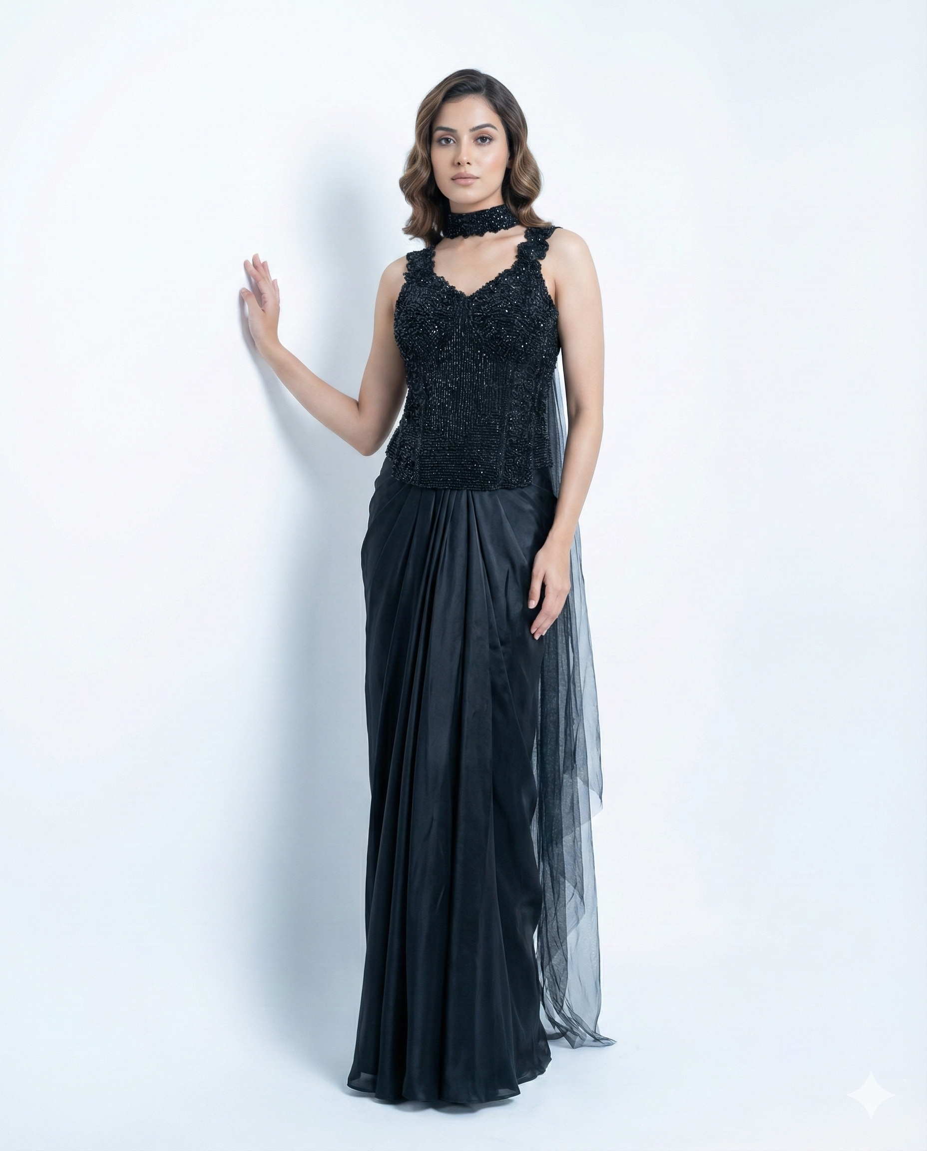 This contemporary ensemble features a stylish crepe tulip skirt paired with a heavy cord-fit blouse detailed with elegant black cutdana work. Finished with a chic choker-style dupatta, the look blends modern sophistication with festive glamour—perfect for cocktail nights, sangeet functions, and statement celebrations.