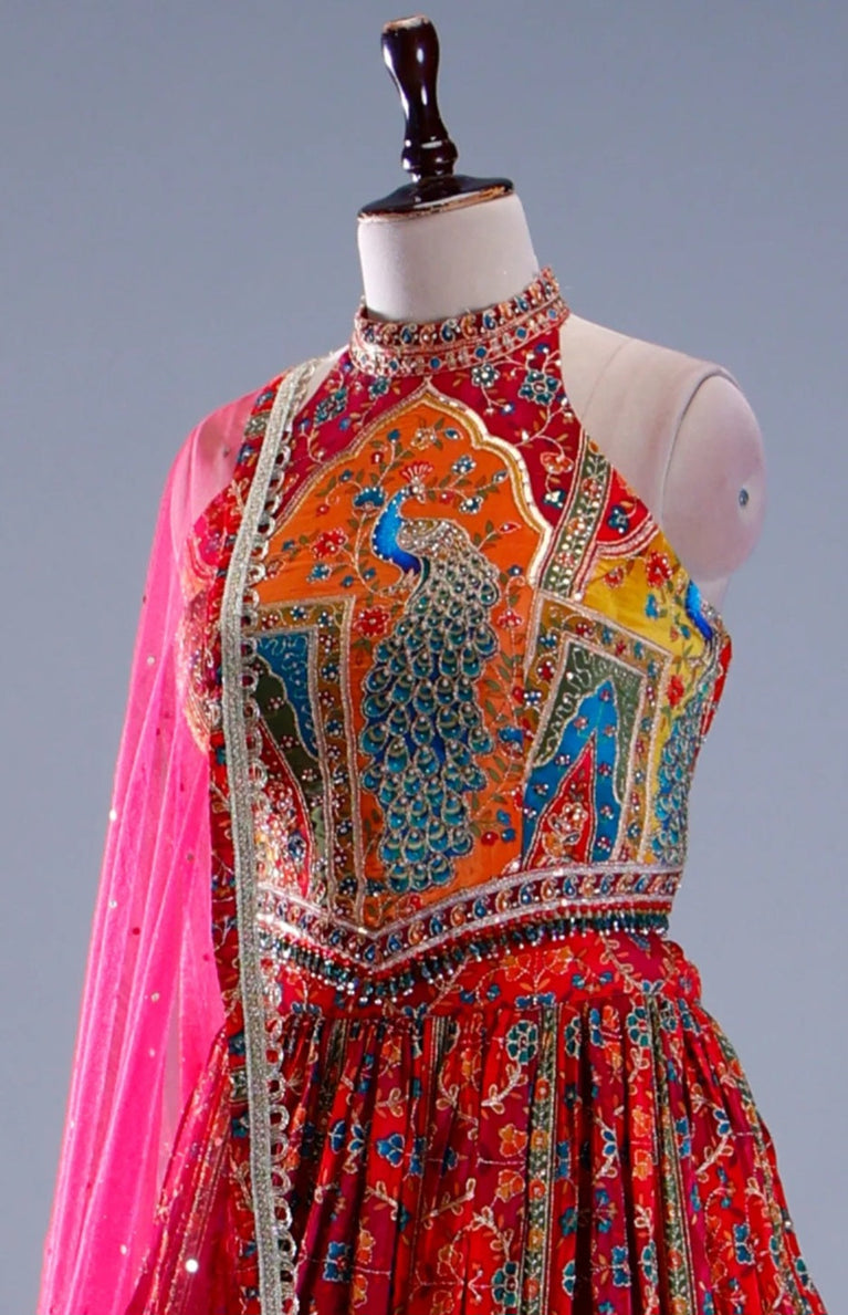 This multicolor peacock georgette lehenga features a bold, heavy peacock print across the blouse and all over the lehenga, creating a striking statement look. Finished with a contemporary halter-neck blouse, the ensemble blends artistic flair with modern elegance—perfect for festive occasions, sangeet functions, and cocktail celebrations.