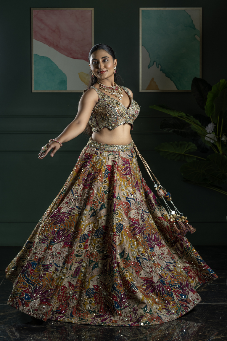 Silk Lehenga with multi color work and stitched mirror work on blouse