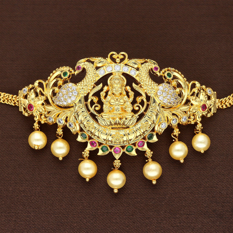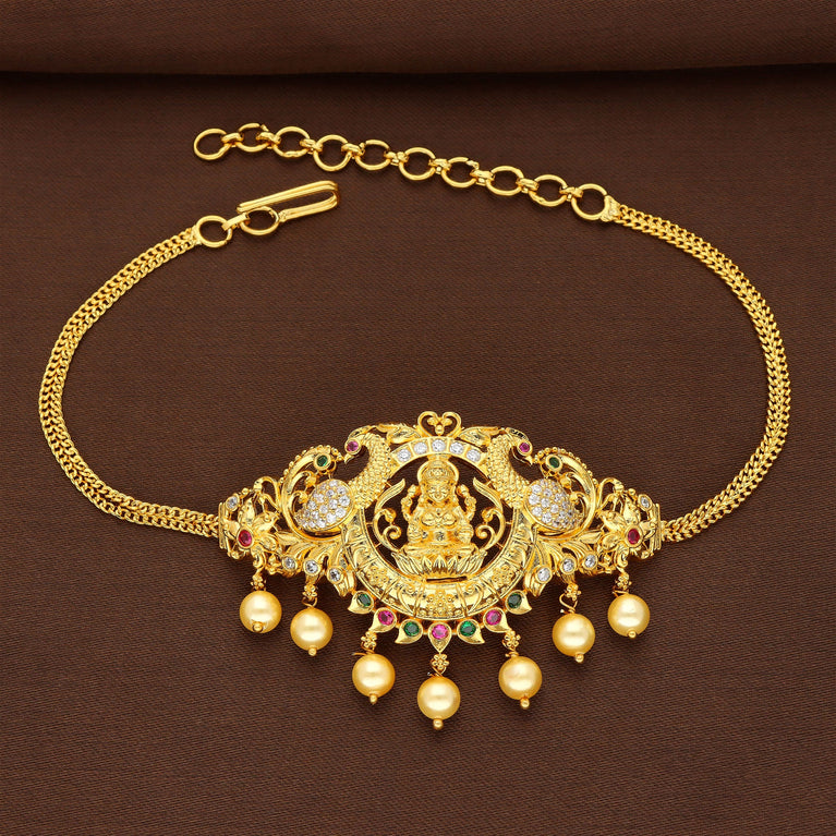 This Designer Lakshmi Devi Chain Bajuband features exquisite ruby, emerald and white accents with a refined matt polish with green beads, offering a traditional yet sophisticated appeal. Perfectly crafted to enhance your ethnic attire with elegance and cultural richness.