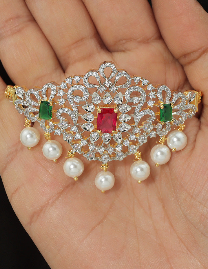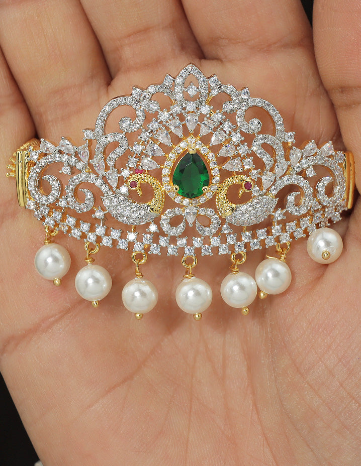 Elevate your style with this Designer Zirconia Chain Bajuband, featuring a GJ Polish Emerald and white design that adds elegance and durability with a stunning sparkle.