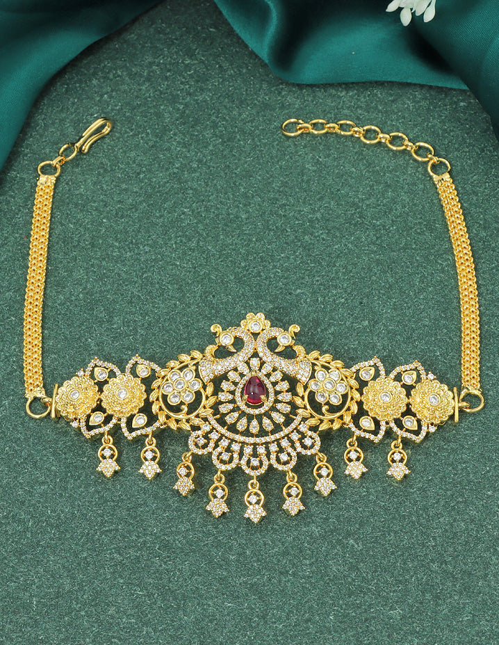 Elevate your style with this Designer Zirconia Chain Bajuband, featuring a Gold Polish Ruby and white design that adds elegance and durability with a stunning sparkle.