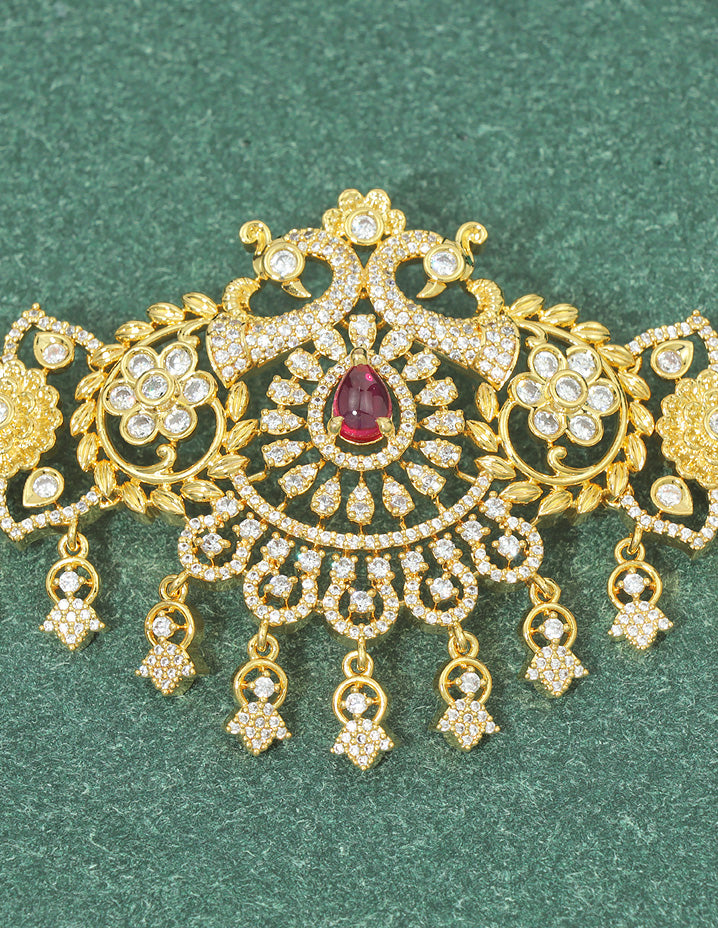 Upgrade your Bajuband with a stunning CZ one. Match it with any outfit and exude style. Featuring American diamonds, rubies stones, this Bajuband has a lustrous gold polish and a beautiful design.