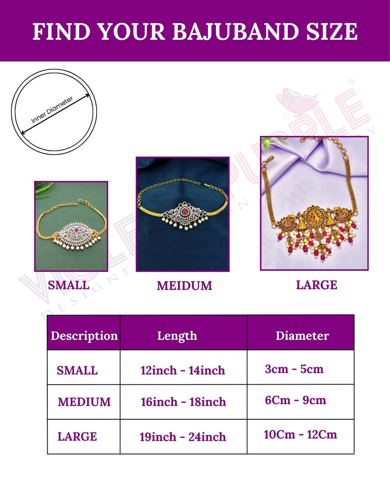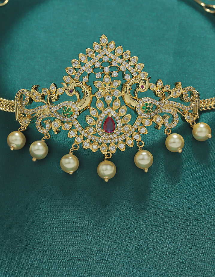 Replace your outdated old bajuband with this scintillating new CZ bajuband. You can match it with your favorite saree or lehenga and flaunt your style. The dazzling American diamonds, rubies and emerald green stones make an amazing blend with the lustrous gold polish and the gorgeous design of the bajuband.