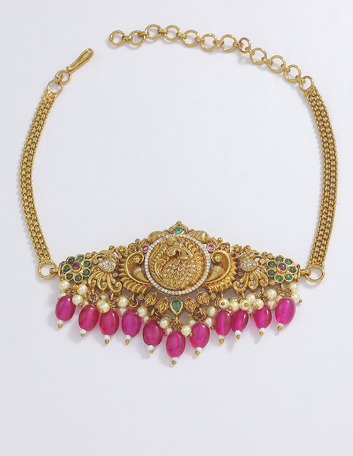 Radiate traditional charm with this antique gold-finish Bajuband, adorned with floral motifs, a striking pink stone centerpiece, green accents, and elegant pearl drops—perfect for festive and bridal wear.