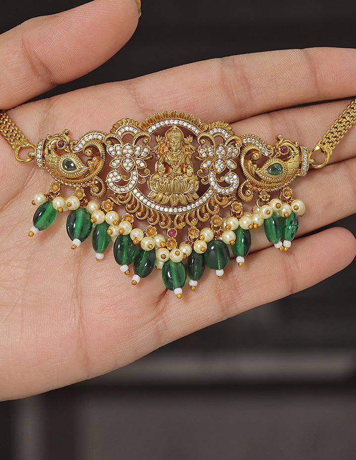 This Designer Lakshmi Devi Chain Bajuband features exquisite ruby and emerald accents with a refined matt polish with green beads, offering a traditional yet sophisticated appeal. Perfectly crafted to enhance your ethnic attire with elegance and cultural richness.