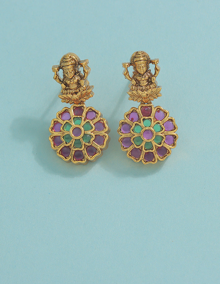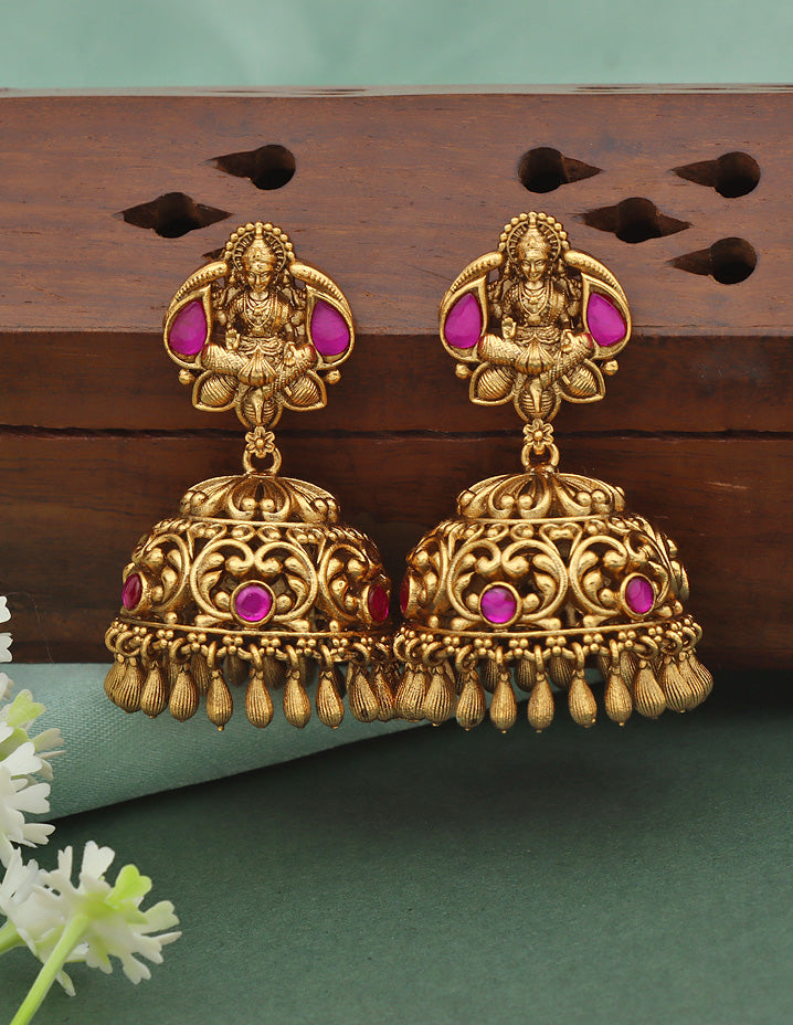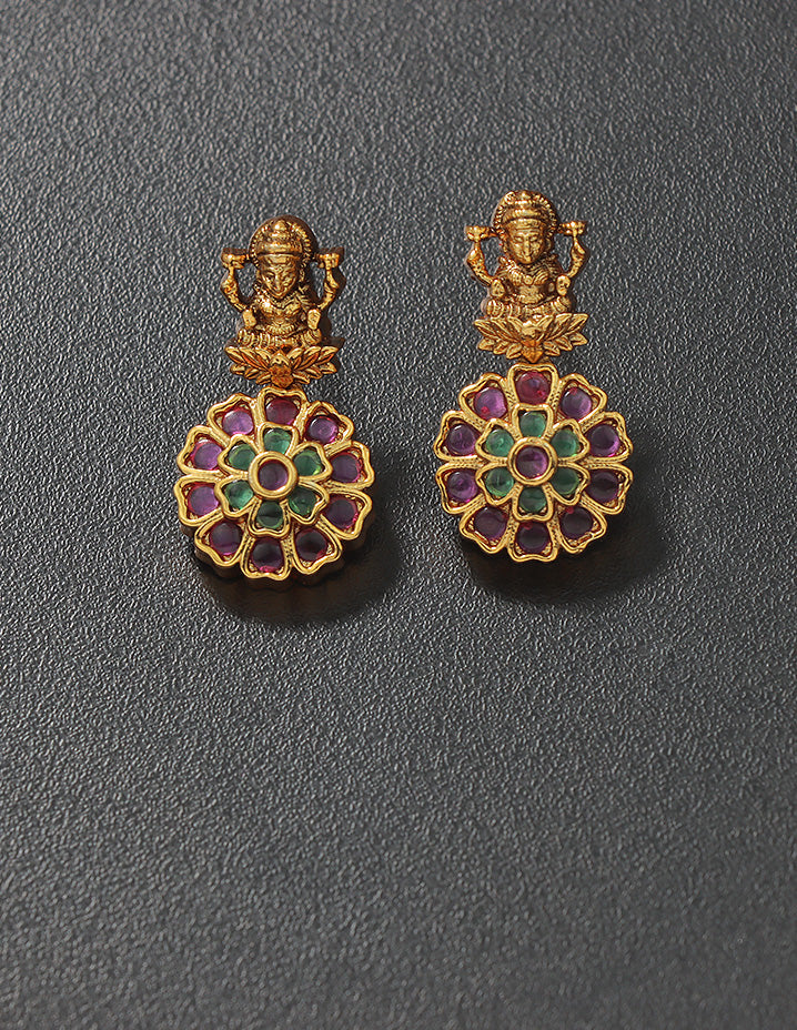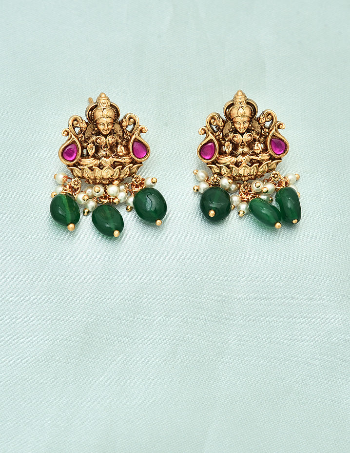 This Matt Kempu Lakshmi Devi Long Haram Set, adorned with Rani Pink & Emerald stones and gold beads, adds a touch of traditional elegance.With matching earrings, it’s the perfect statement piece for any occasion, making a bold, eye-catching impact.