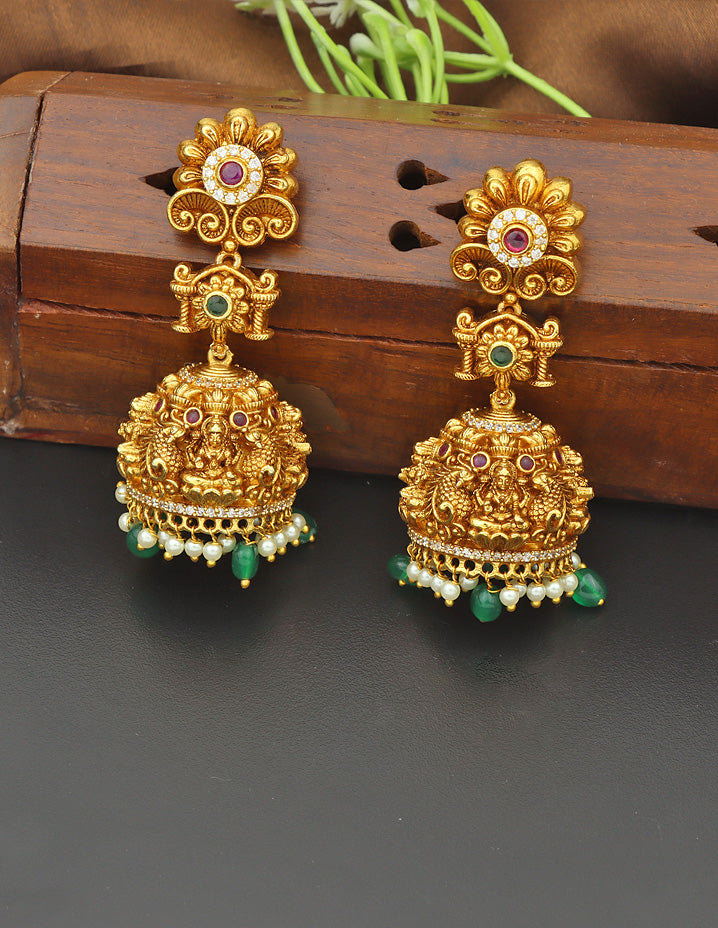 Grace your traditional look with this Matt Kempu Lakshmi Devi Long Haram, featuring radiant ruby & emerald stones with elegant gold balls. Complete with matching earrings, it’s a timeless piece that adds rich desi charm and makes every occasion special.