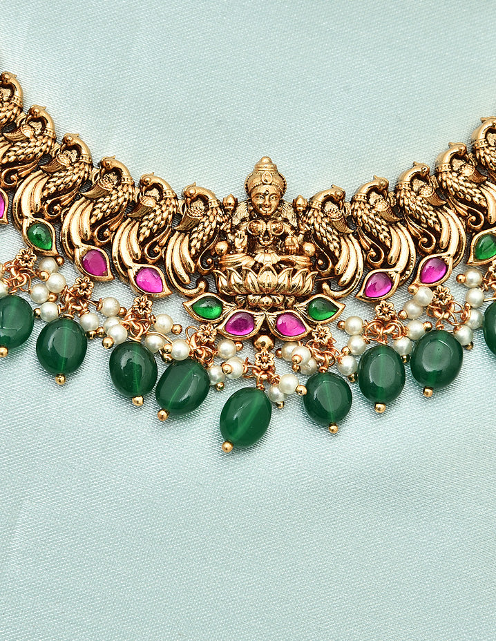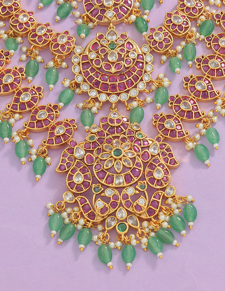 Designer Matt Rani Pink & Emerald Lakshmi Devi Long Haaram Set