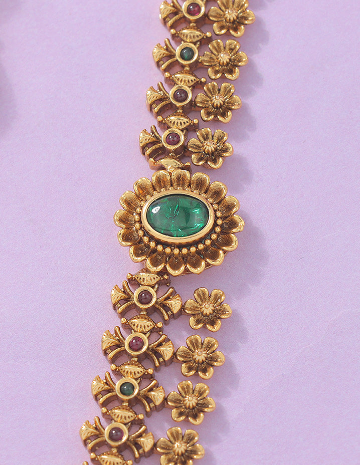 This beautiful Matt Gold Plated Floral Design Long Haaram Set is made of the highest quality metalwork and embroidered with dazzling Ruby and Emerald Stones Paired with matching earrings set in traditional ethnic artwork, it's perfect for any traditional occasion and makes a bold style statement with its eye-catching desi looks.