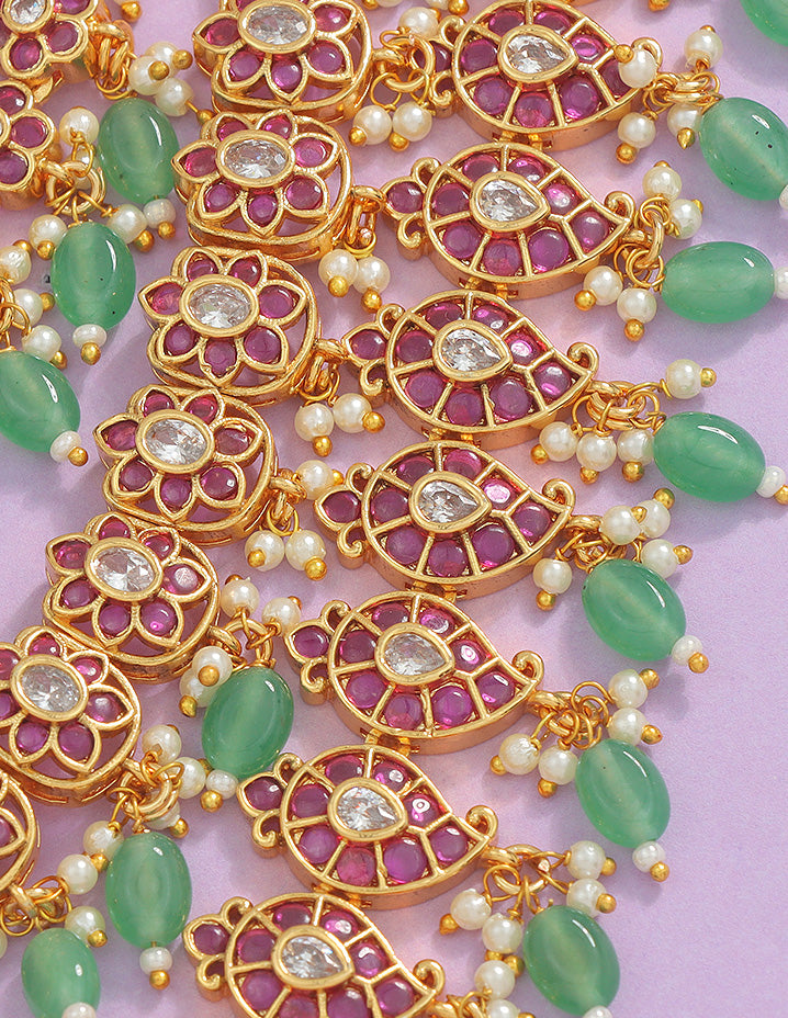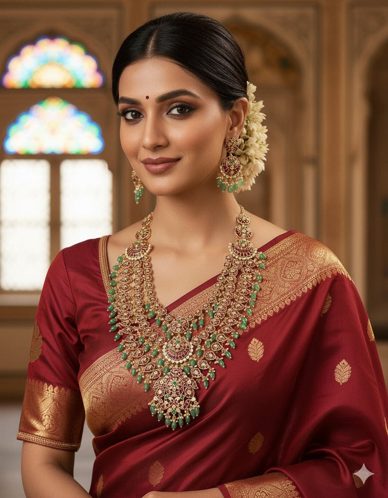 Elevate your style with the Matt Ruby Kempu Long Haram Set, adorned with striking green beads and crafted with precision. A timeless piece that exudes luxury and sophistication, perfect for making a bold, elegant statement.