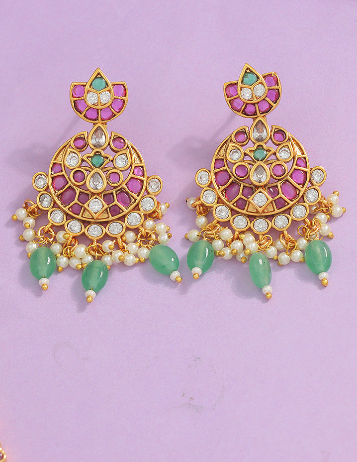 This Matt Kempu Lakshmi Devi Long Haram Set, featuring dazzling Rani Pink stones with gold beads, radiates timeless elegance. Paired with matching earrings, it’s the perfect accessory for any traditional occasion, making a bold and eye-catching statement.