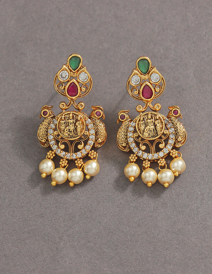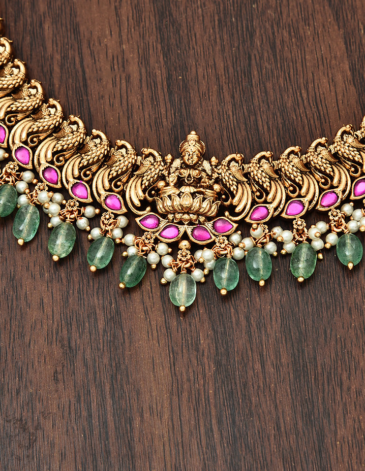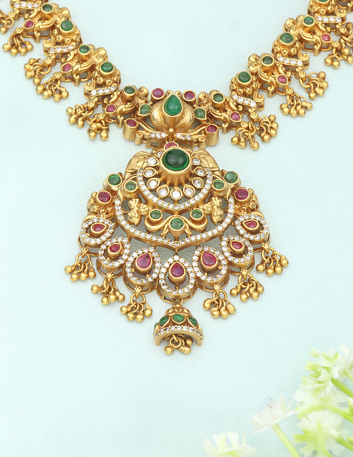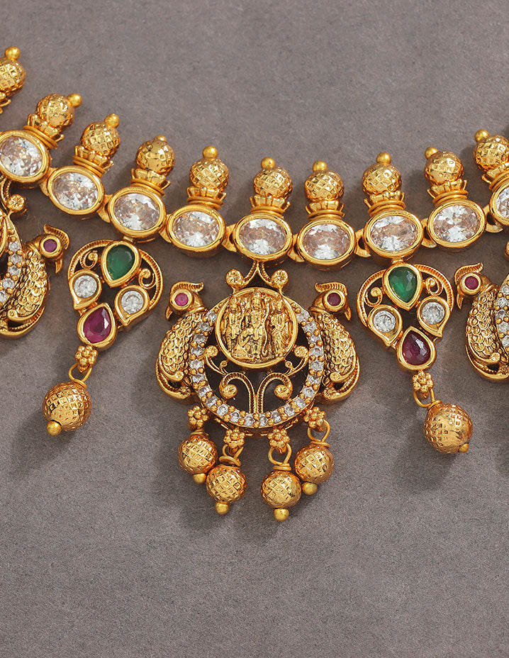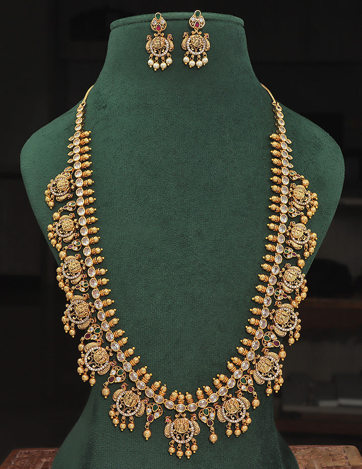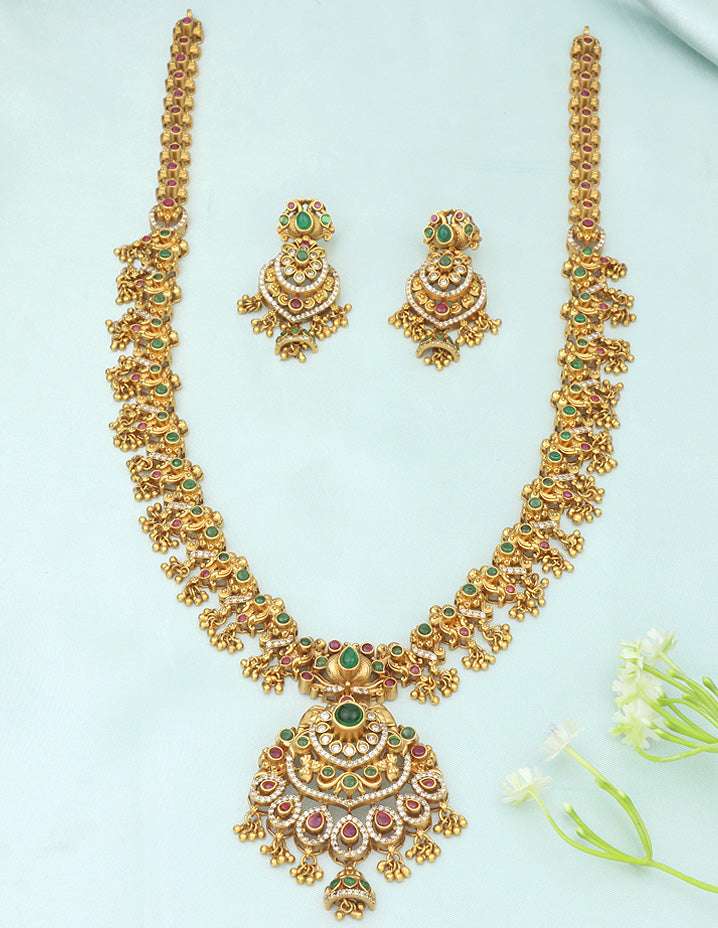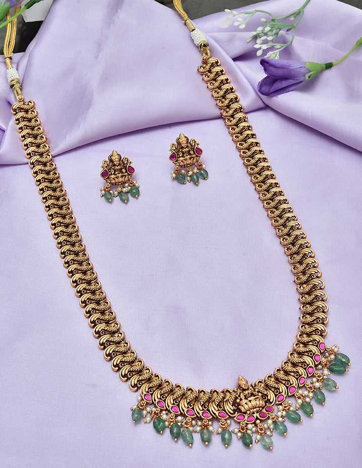 This stunning Matt Kempu Lakshmi Devi Long Haram Set features Ruby, Emerald CZ stones and rich emerald beads, crafted with intricate traditional artistry. Paired with elegant earrings, it's a perfect choice to make a bold, graceful statement at any festive or traditional occasion.