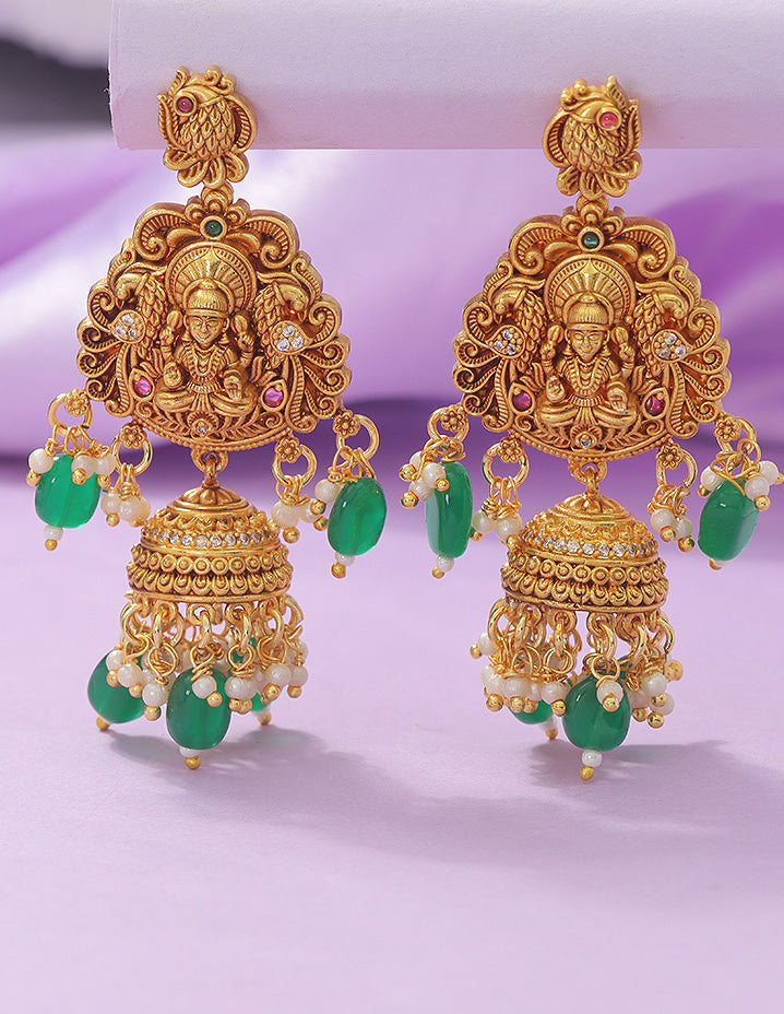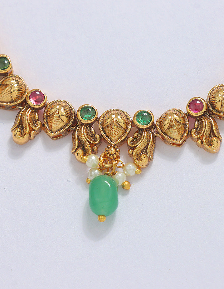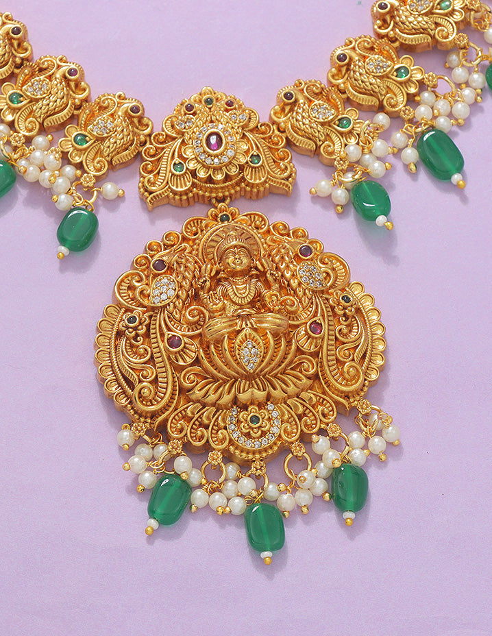 This Designer Lakshmi Devi Necklace Set features a stunning peacock design accented with green beads, arranged precisely in two elegant lines. Crafted to symbolize grace and tradition, it adds a refined touch to any festive ensemble.