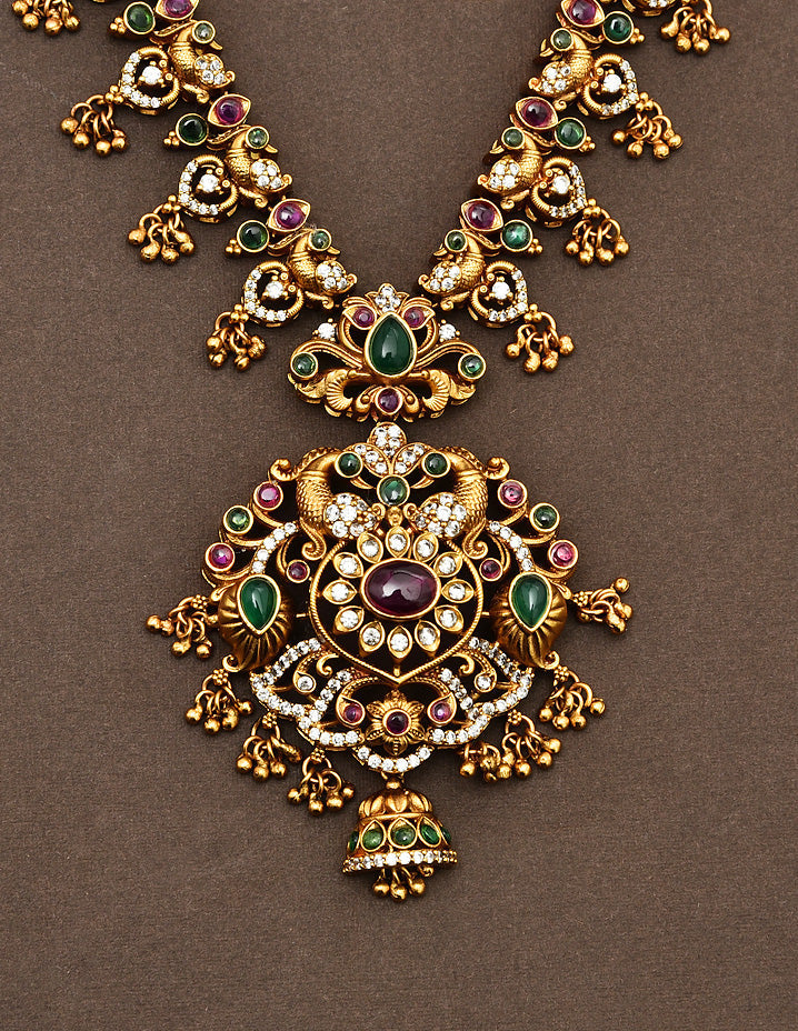 The Designer Matt Zirconia Necklace Set features a stunning peacock design, adorned with exquisite Ruby, Emerald, and white stones of Lakshmi Devi. Expertly crafted, this set is sure to elevate any outfit and make a bold statement. Experience luxury and elegance with this one-of-a-kind necklace set.