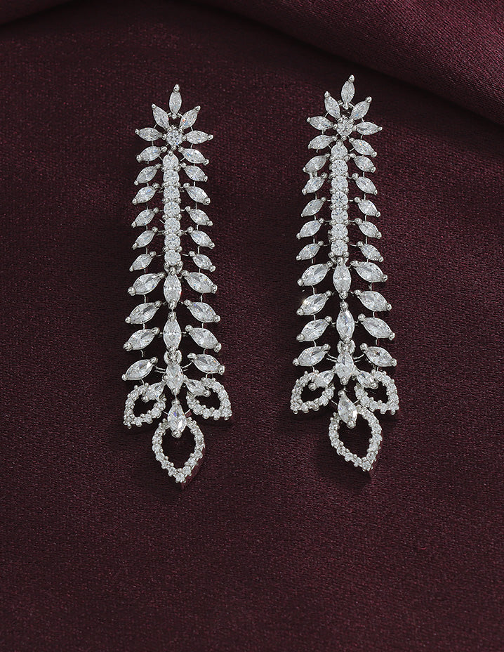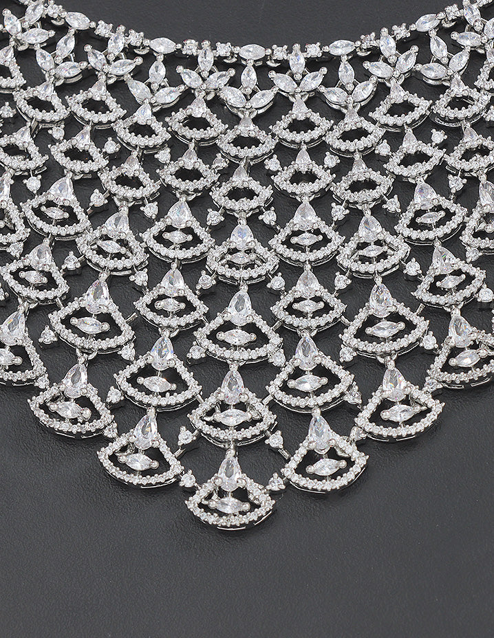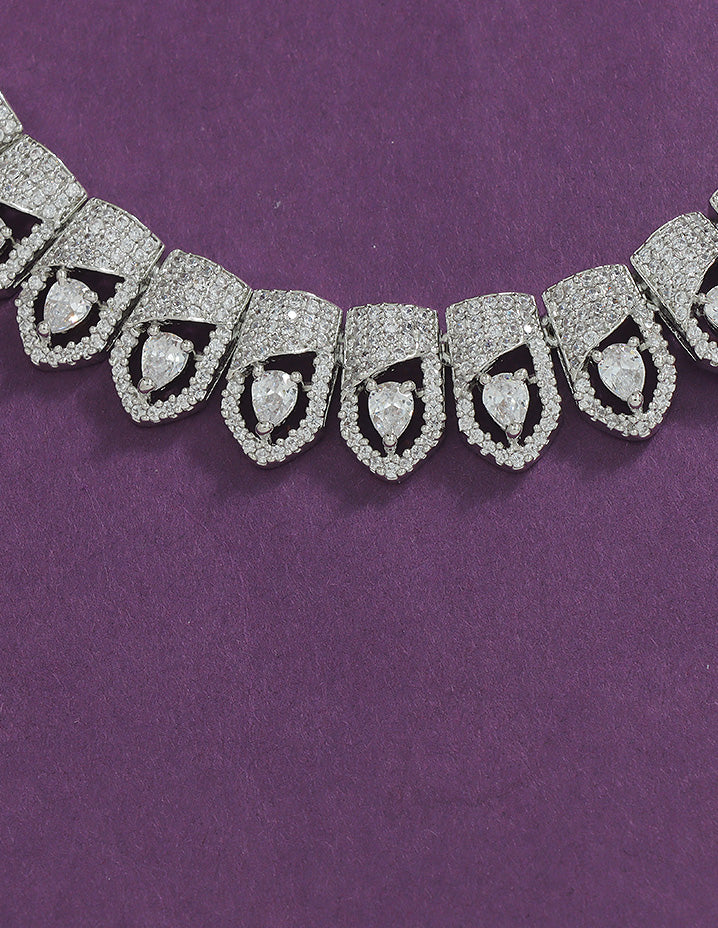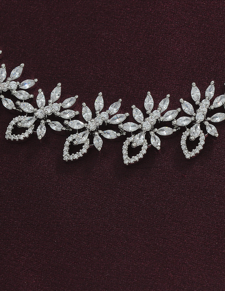 A radiant Rhodium-toned necklace and earring set adorned with sparkling Bud and floral motifs, perfectly blending elegance and charm for your special occasions.