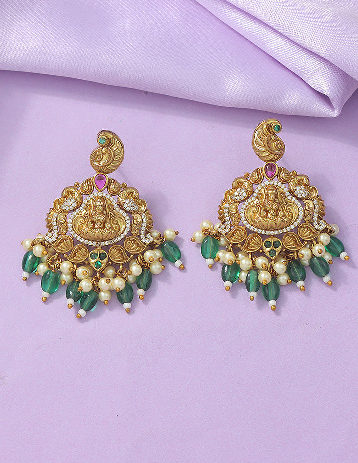 Elevate your bridal ensemble with this Designer Lakshmi Devi Necklace Set, featuring a matt antique polish for timeless elegance. Crafted with intricate detailing and adorned with vibrant green beads arranged in two graceful lines, this set beautifully honors tradition while enhancing your regal look. Perfect for special occasions, it combines classic artistry with expert craftsmanship to complement your bridal attire effortlessly.
