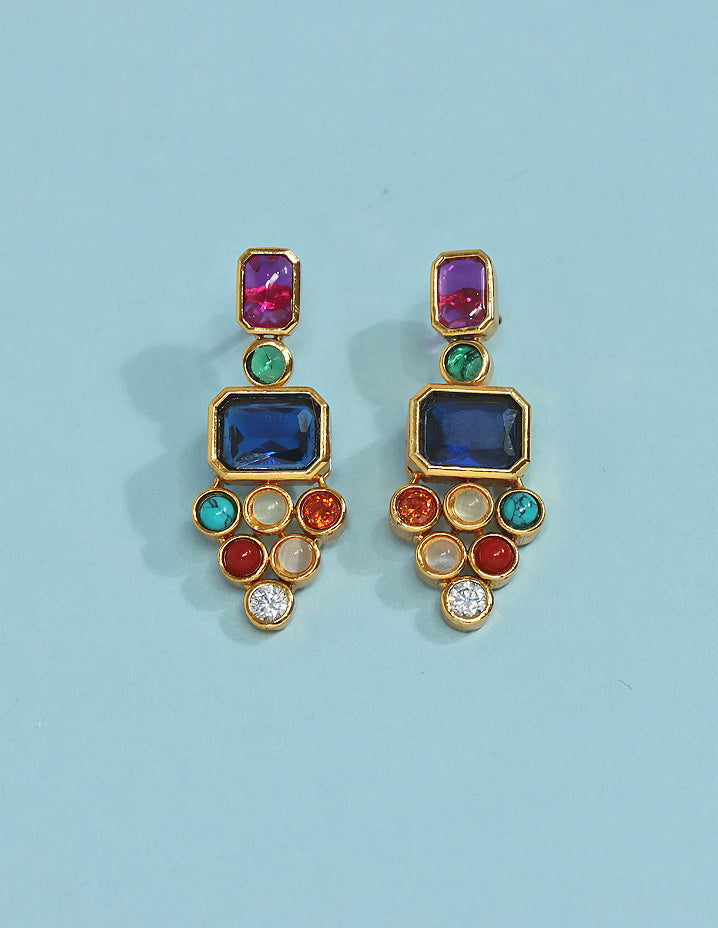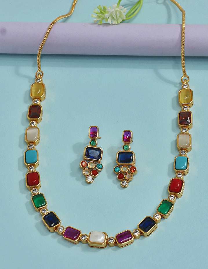 This Designer Matt Plated Navaratna Necklace Set showcases a stunning combination of traditional and contemporary design. The gold-plated necklace features nine precious gemstones, believed to bring protection and good fortune to the wearer. Elevate any look with this exquisite and meaningful piece.