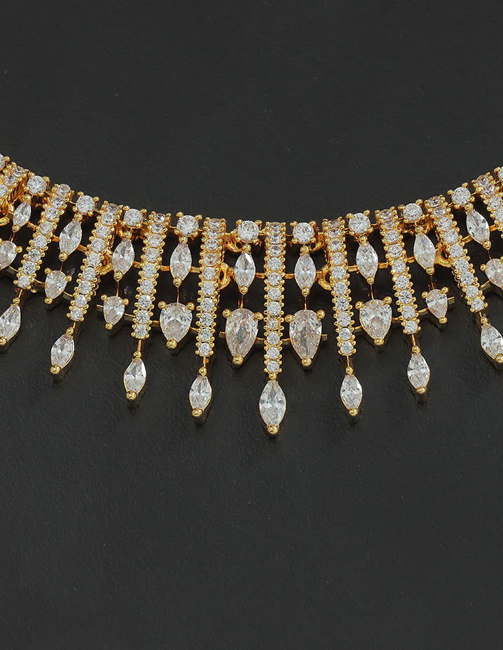 This Designer Zirconia Elegance Necklace Set features exquisite white stones set in a refined gold and rhodium polish, offering timeless sophistication. Perfectly crafted to elevate any ensemble with expert attention to detail and lasting brilliance.