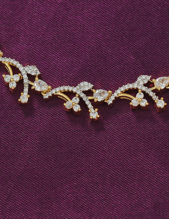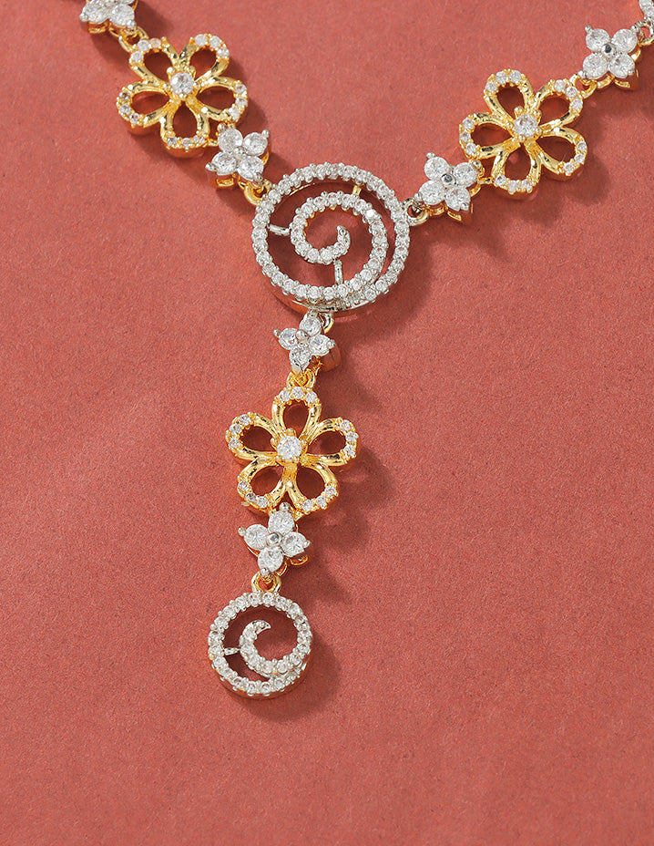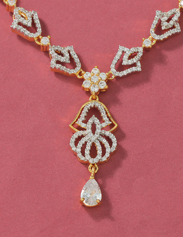 This Designer Zirconia Elegance Necklace Set features exquisite white stones set in a refined gold and rhodium polish, offering timeless sophistication. Perfectly crafted to elevate any ensemble with expert attention to detail and lasting brilliance.