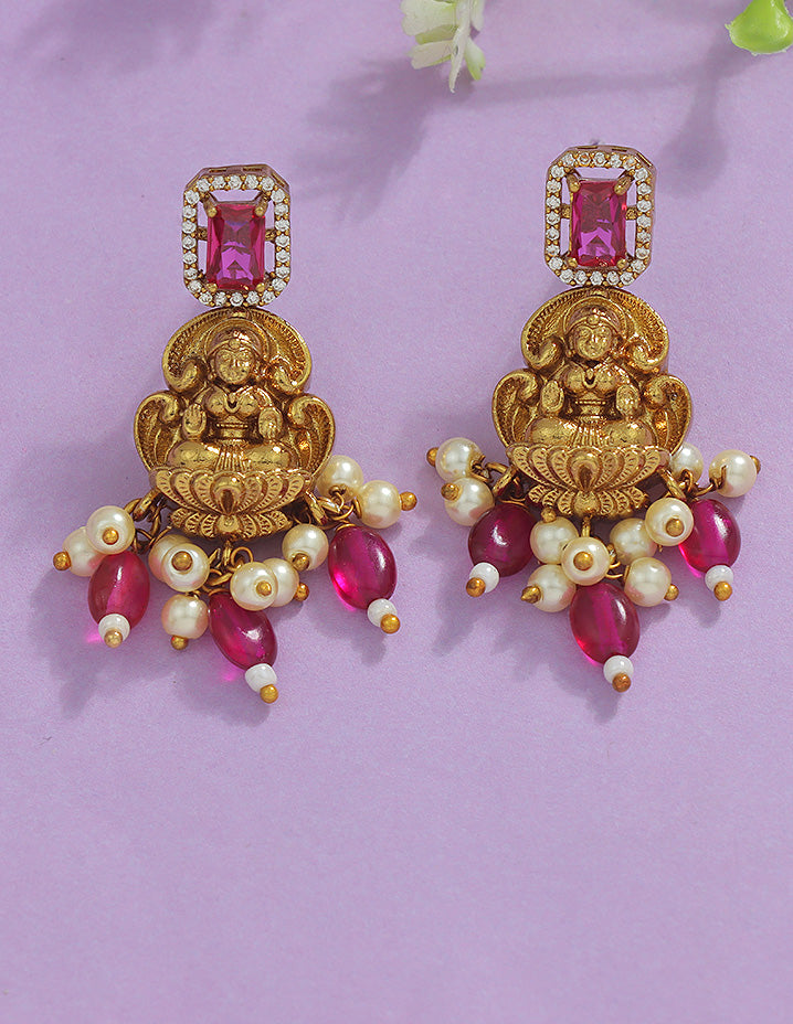 This Matt Polish Kempu Necklace Set, studded with dazzling ruby stones, radiates elegance and style. Its unique design is a visual treat, making it the perfect statement piece for any occasion.