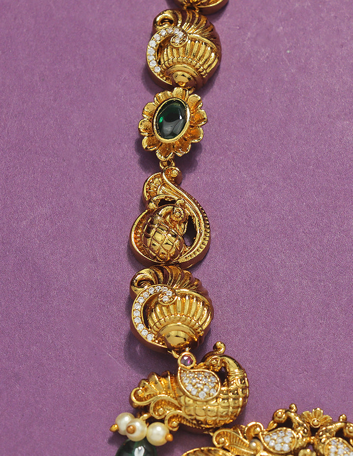 The Designer Matt Zirconia Necklace Set features a stunning peacock design, adorned with exquisite Ruby, Emerald, and white stones of Lakshmi Devi. Expertly crafted, this set is sure to elevate any outfit and make a bold statement. Experience luxury and elegance with this one-of-a-kind necklace set.