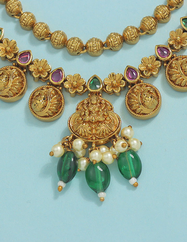 The Designer Lakshmi Devi Necklace Set features beautiful green beads and a detailed peacock design. This elegant set adds a traditional touch to any outfit, perfect for special occasions.