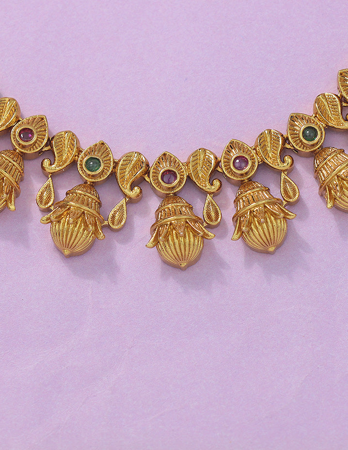 This Matt Polish Kempu Necklace Set, studded with dazzling ruby and emerald stones, radiates elegance and style. Its unique design is a visual treat, making it the perfect statement piece for any occasion.