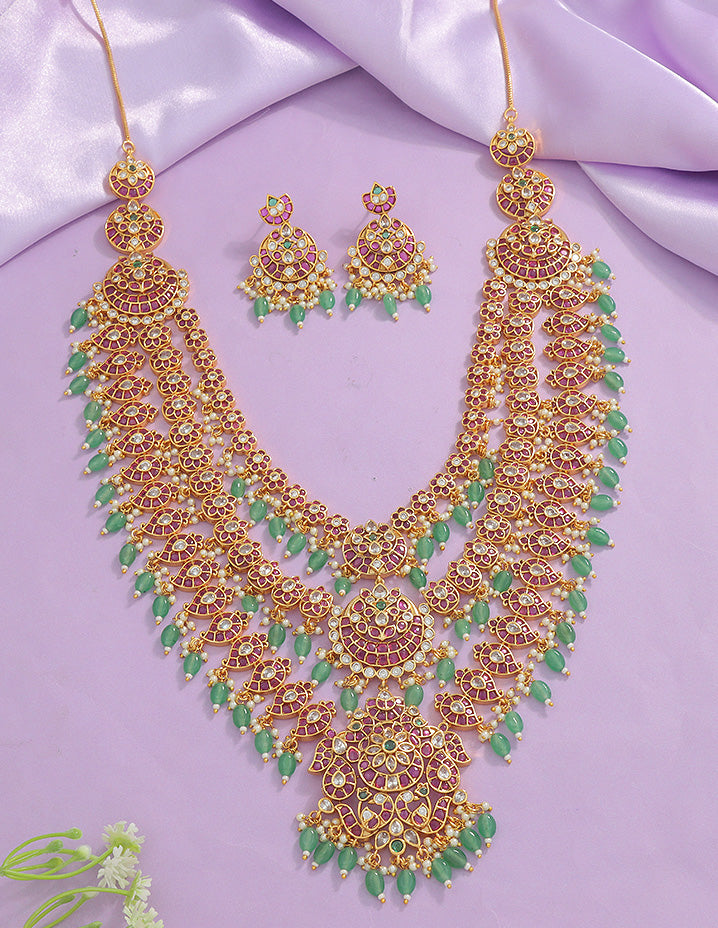 This Designer Kempu Grand Wedding 3 Layered Haaram Set features intricately crafted matt polish green beads, enhancing its traditional elegance. Perfect for grand occasions, it offers a regal statement with its rich design and layered charm.