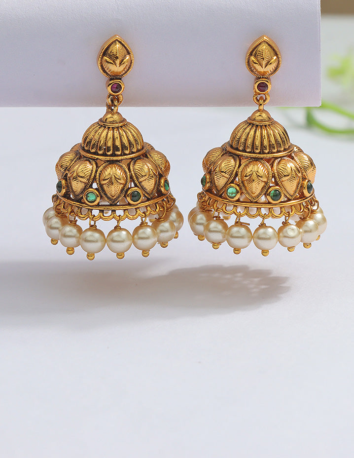The Designer Kempu Necklace Set showcases a simple yet elegant matt finish enhanced with vibrant ruby and emerald stones. Paired with matching jhumkas, this set perfectly balances traditional design and minimalist style, making it an ideal choice for complementing your ethnic wardrobe with a touch of refined sophistication.