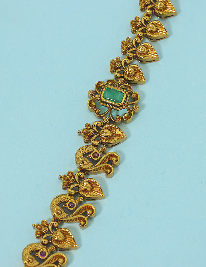 Turn heads with this elegant Antique Polish Kempu Necklace, studded in Ruby & Emerald stones. Its unique design adds the perfect traditional charm to any festive look!