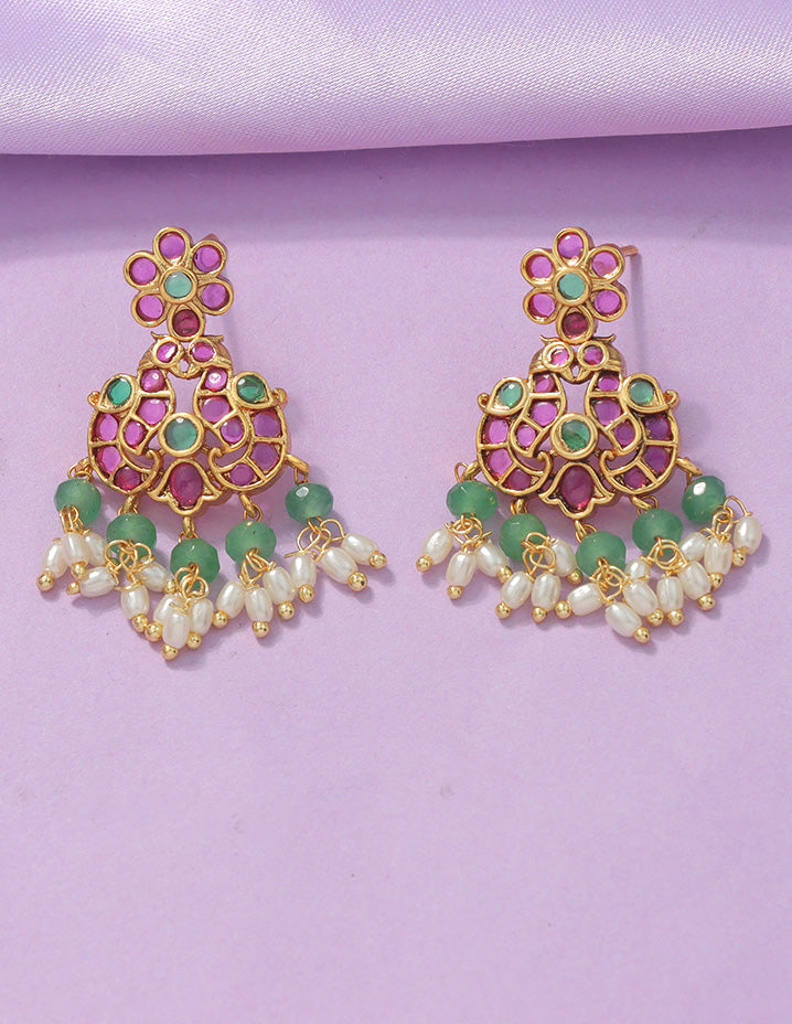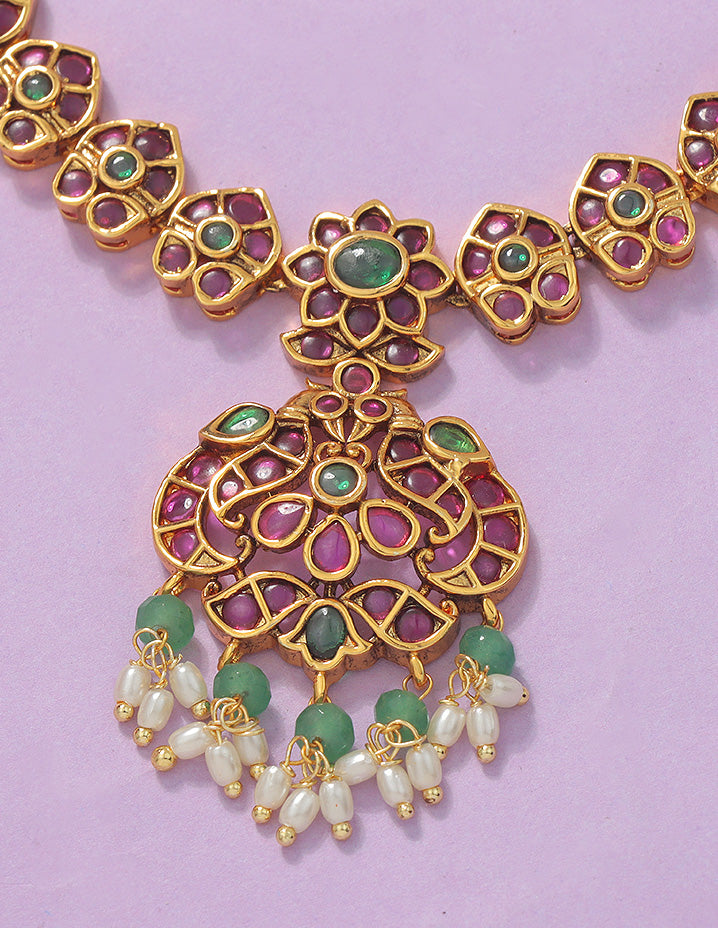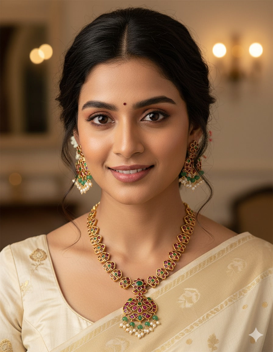 This Designer Matt Kempu Necklace Set features exquisite ruby, emerald stones with a refined matt polish finish. Its elegant two-line design blends traditional artistry with sophisticated charm.