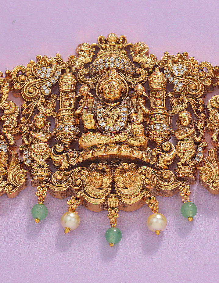 The Designer Matt Lakshmi Devi Chain Vaddanam appeals to customers who value intricate zirconia detailing and traditional elegance. It meets the demand for ornate, culturally significant jewelry with a modern designer finish.