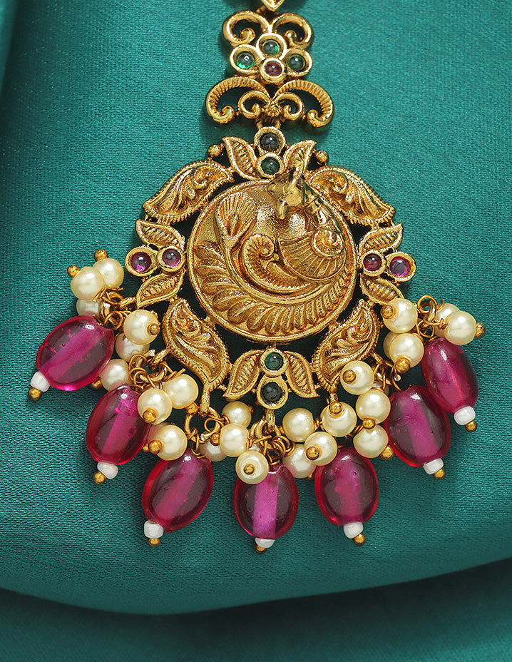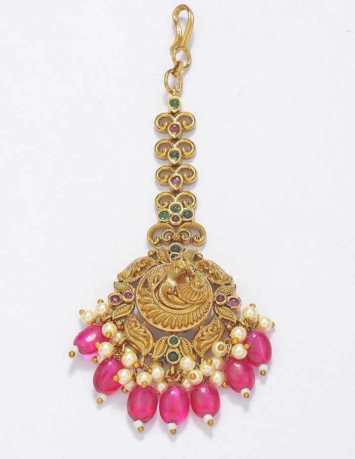 This Designer Matt Peacock Maang Tikka showcases exquisite pearl matt finish and rich ruby bead detailing. Expertly crafted to enhance your traditional attire with timeless elegance.
