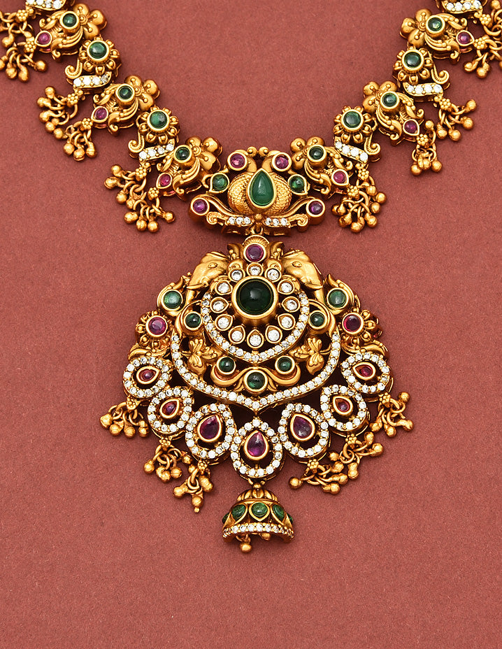 The Designer Matt Zirconia Necklace Set features a stunning peacock design, adorned with exquisite Ruby, Emerald, and white stones. Expertly crafted, this set is sure to elevate any outfit and make a bold statement. Experience luxury and elegance with this one-of-a-kind necklace set.