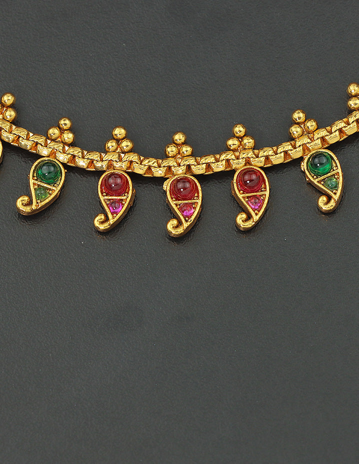 Adorn your ankles with elegance using the Paisley Grace Kemp Anklet Set, featuring vibrant ruby and emerald kemp stones in charming paisley motifs. A graceful blend of tradition and style, perfect for festive flair or everyday ethnic wear.